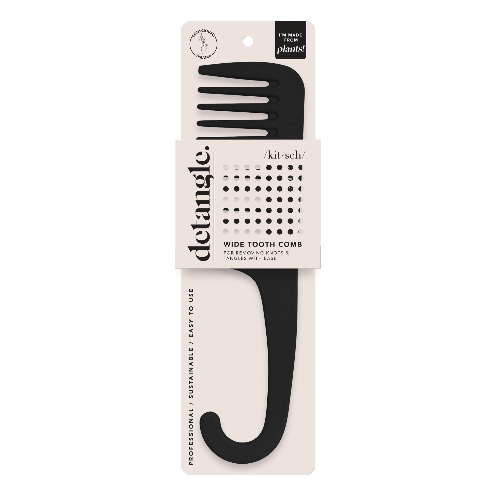 Wide Tooth Comb For Removing Knots & Tangles With Ease WHAT: The Kitsch Wide Tooth Comb is the perfect hair tool to gently detangle your hair. HOW: Use while in the shower to evenly disperse conditioner & stimulate the scalp. WHY: The no-slip texture makes using this comb effortless without losing grip. Helps loosely brush out styled curls and natural texture without adding frizz. Benefits: -Helps reduce hair breakage -Gently detangles wet & dry hair -Smooths frizz -Stimulates scalp for hair growth -Ideal for straight sleek hair styles -No-slip coating for ultimate grip Material Composition: Brush Handle: PLA environmentally friendly corn starch fibers Product Information: 2” wide brush handle 2.5” wide comb 9” long
