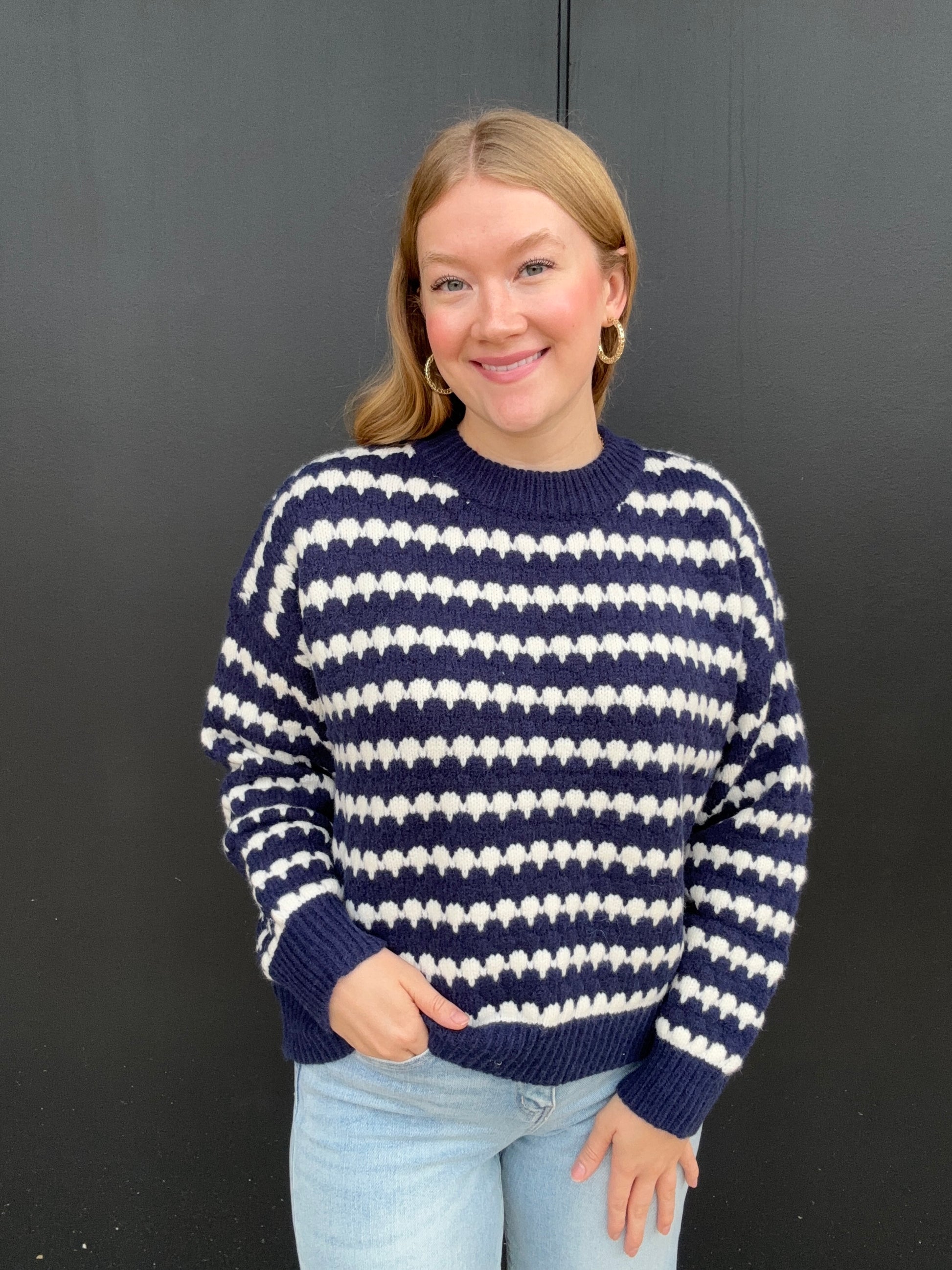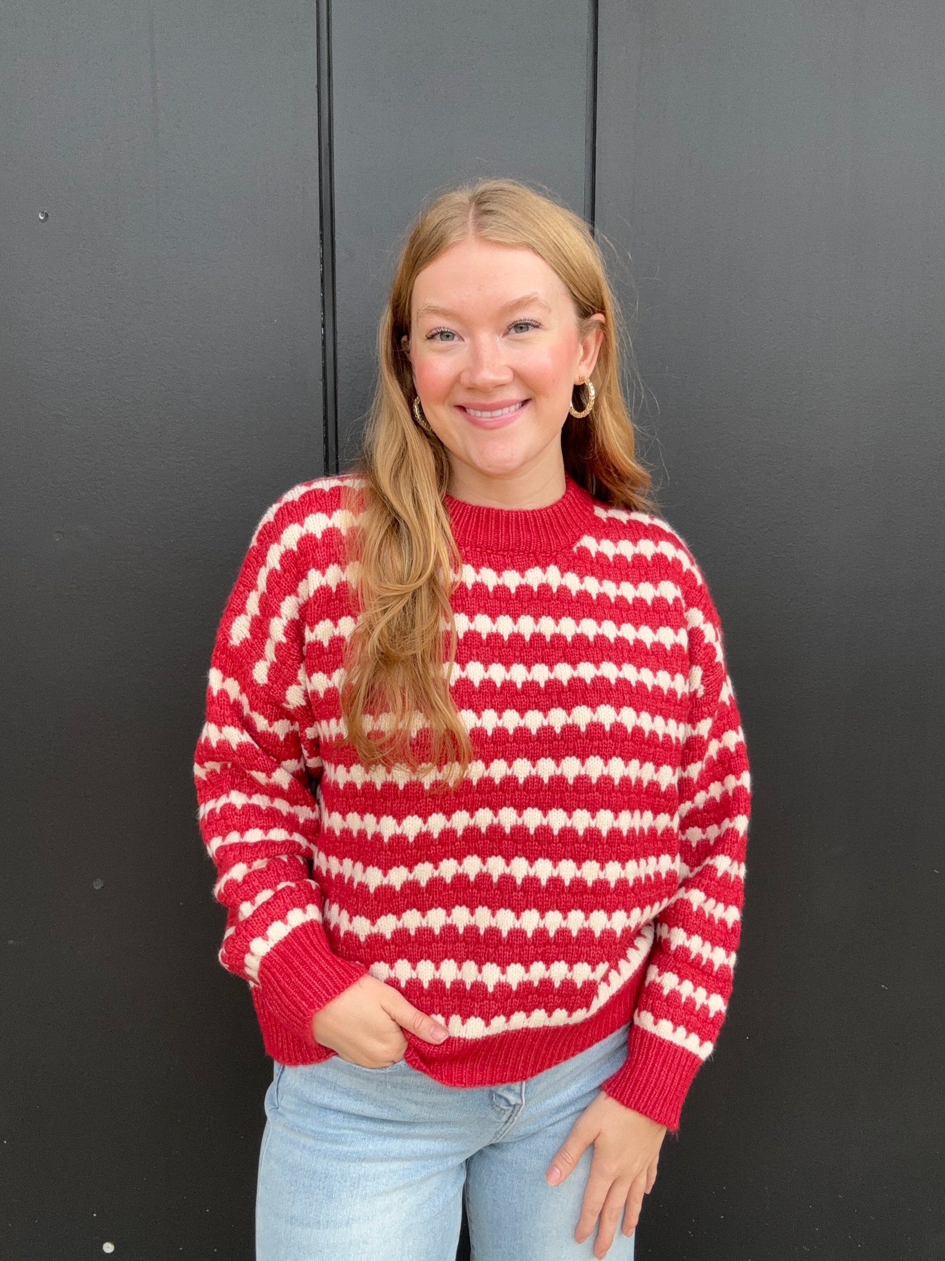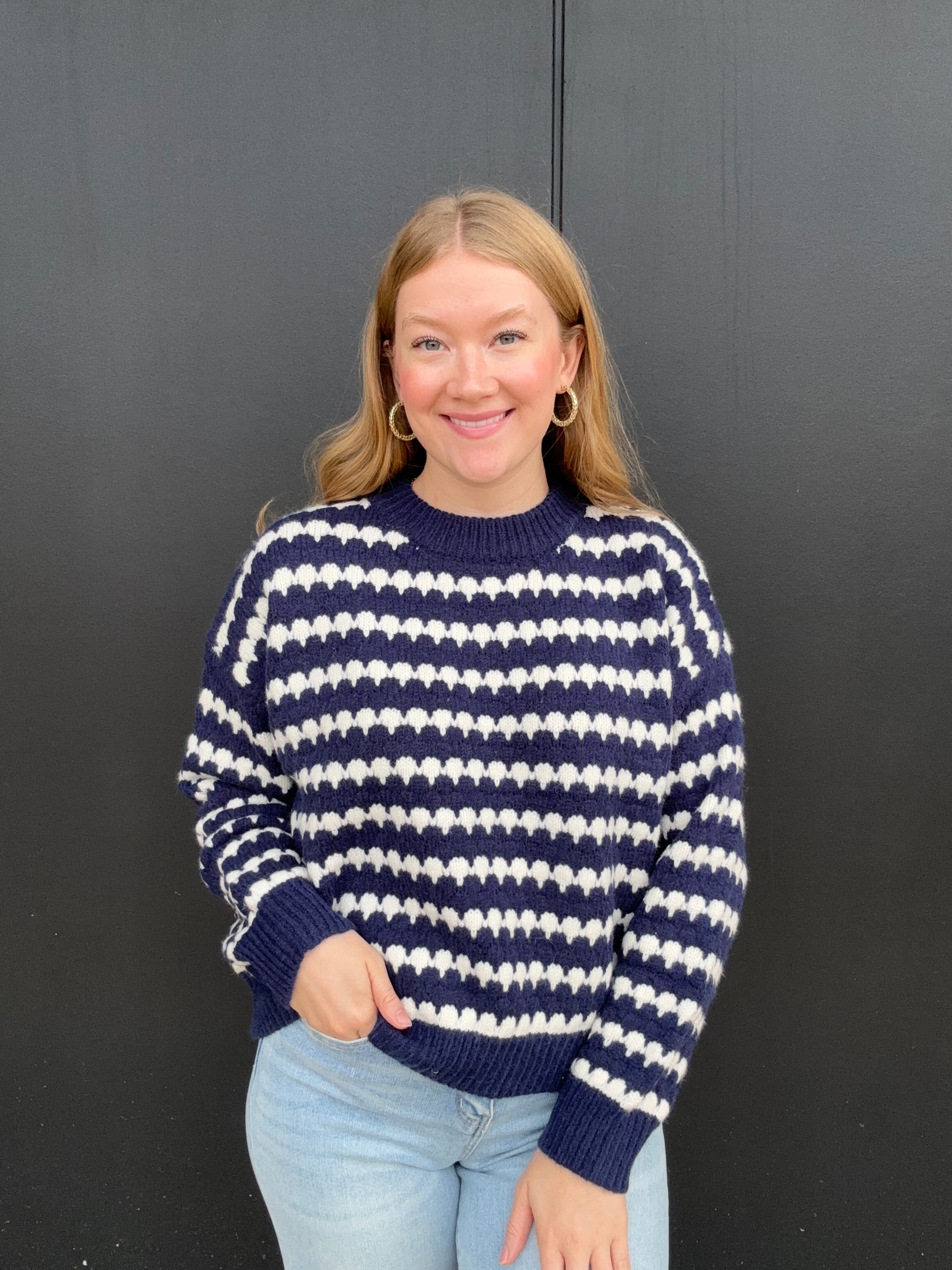 Everyone could use a stripe sweater in their collection, this one comes in navy and red with white stripes. Wear either sweater all fall and winter, but the red is perfect for the holiday's. This sweater will keep you warm and includes a round neck, long sleeves, and a drop shoulder fit. Olivia is 5'8 wearing size small.