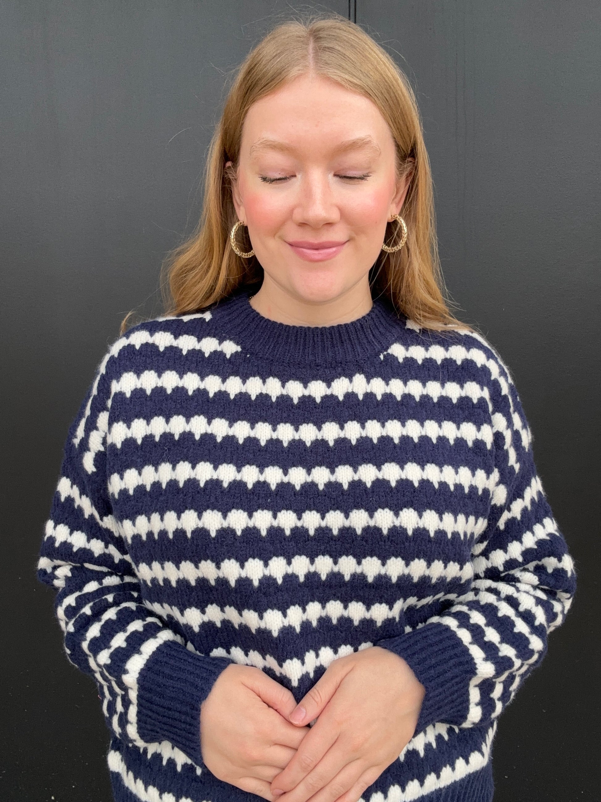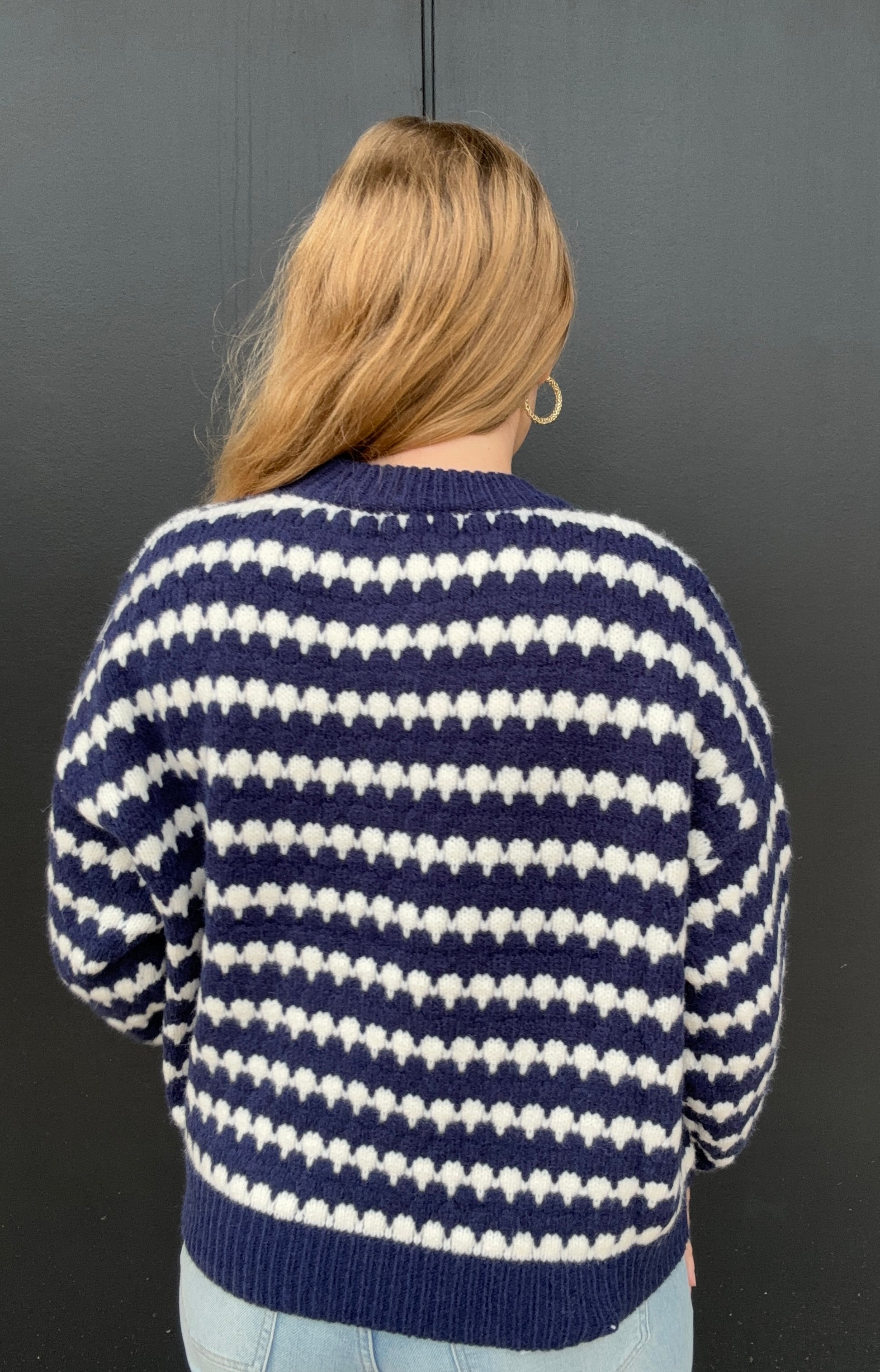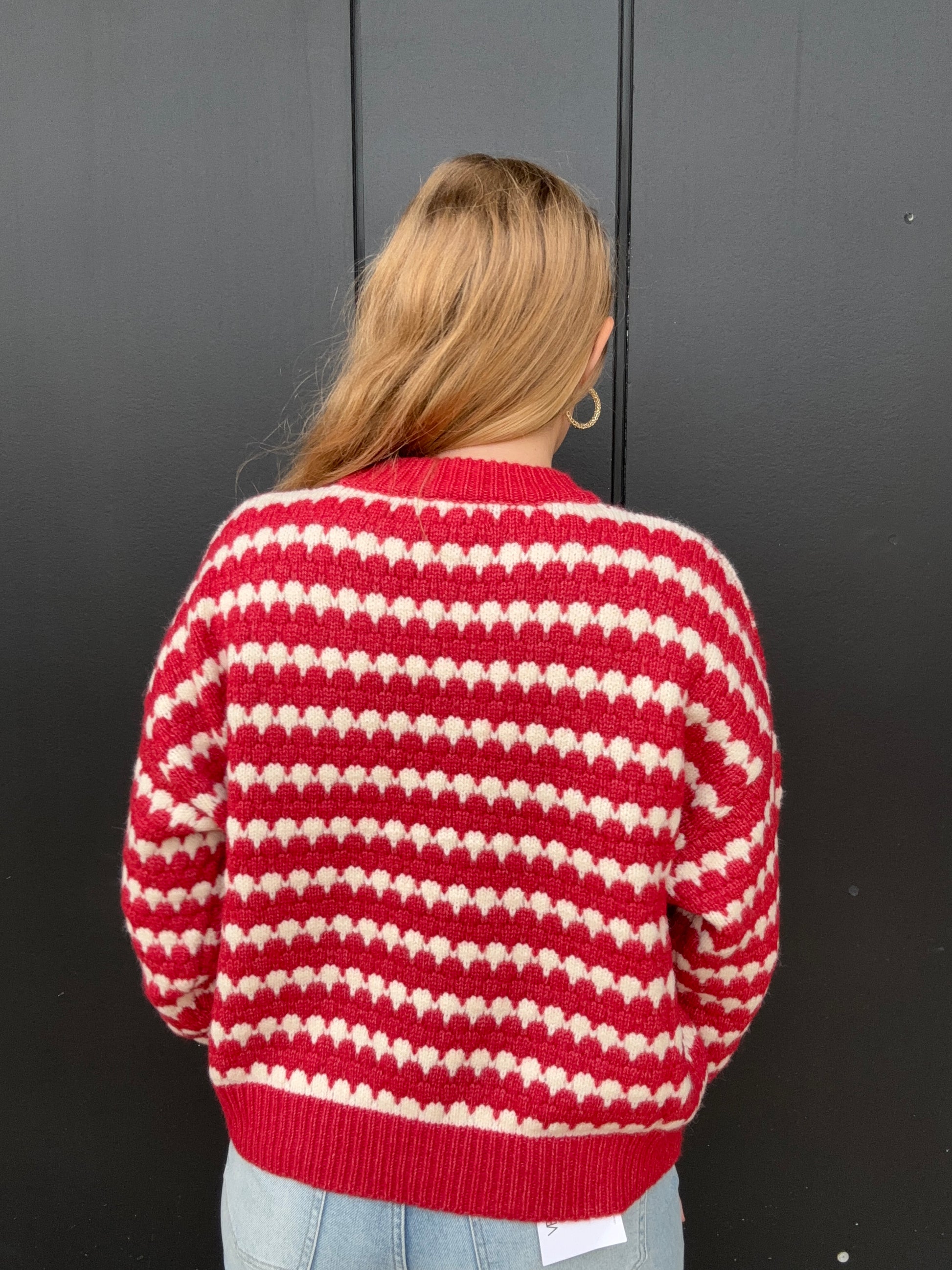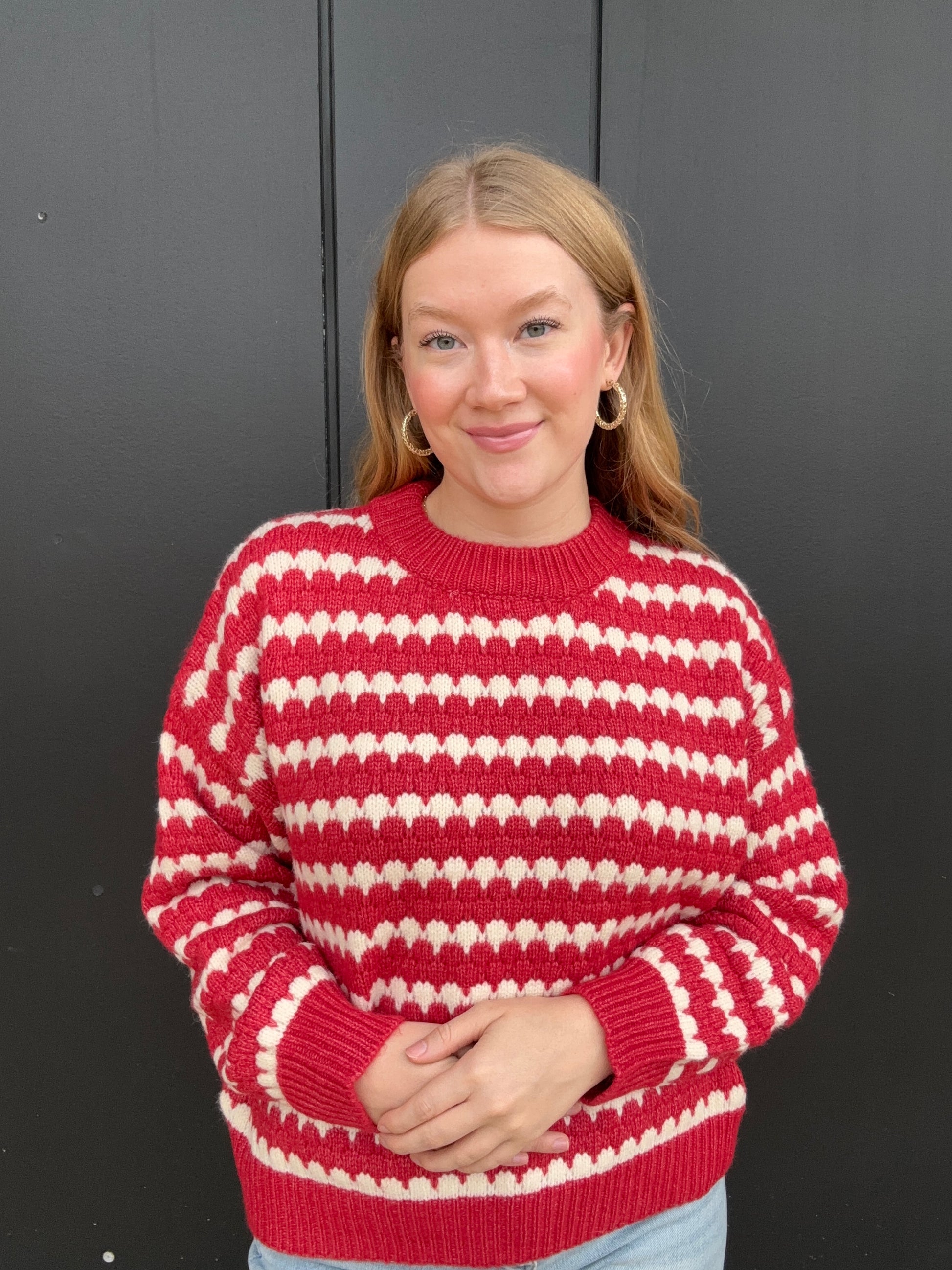 Everyone could use a stripe sweater in their collection, this one comes in navy and red with white stripes. Wear either sweater all fall and winter, but the red is perfect for the holiday's. This sweater will keep you warm and includes a round neck, long sleeves, and a drop shoulder fit. Olivia is 5'8 wearing size small.