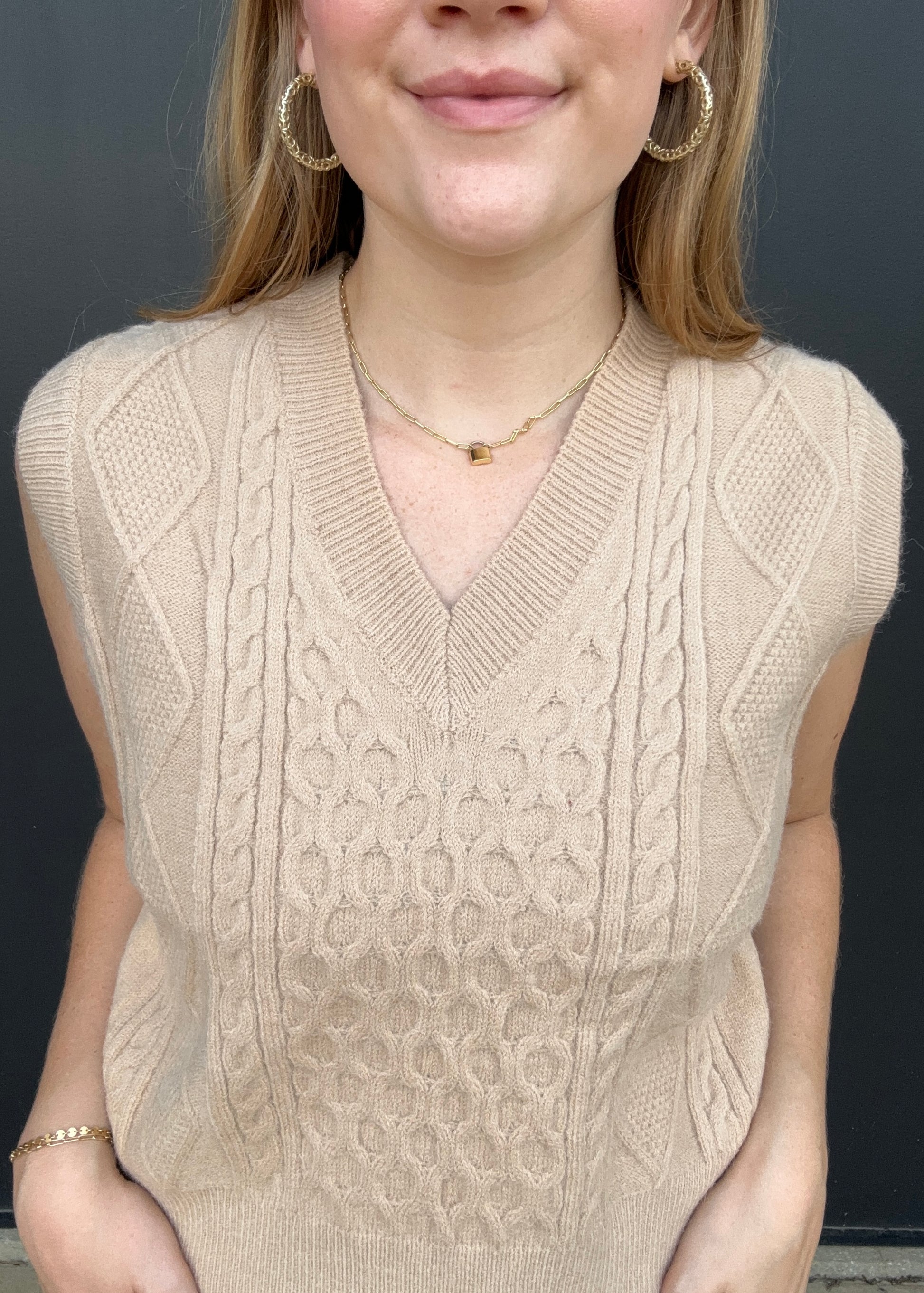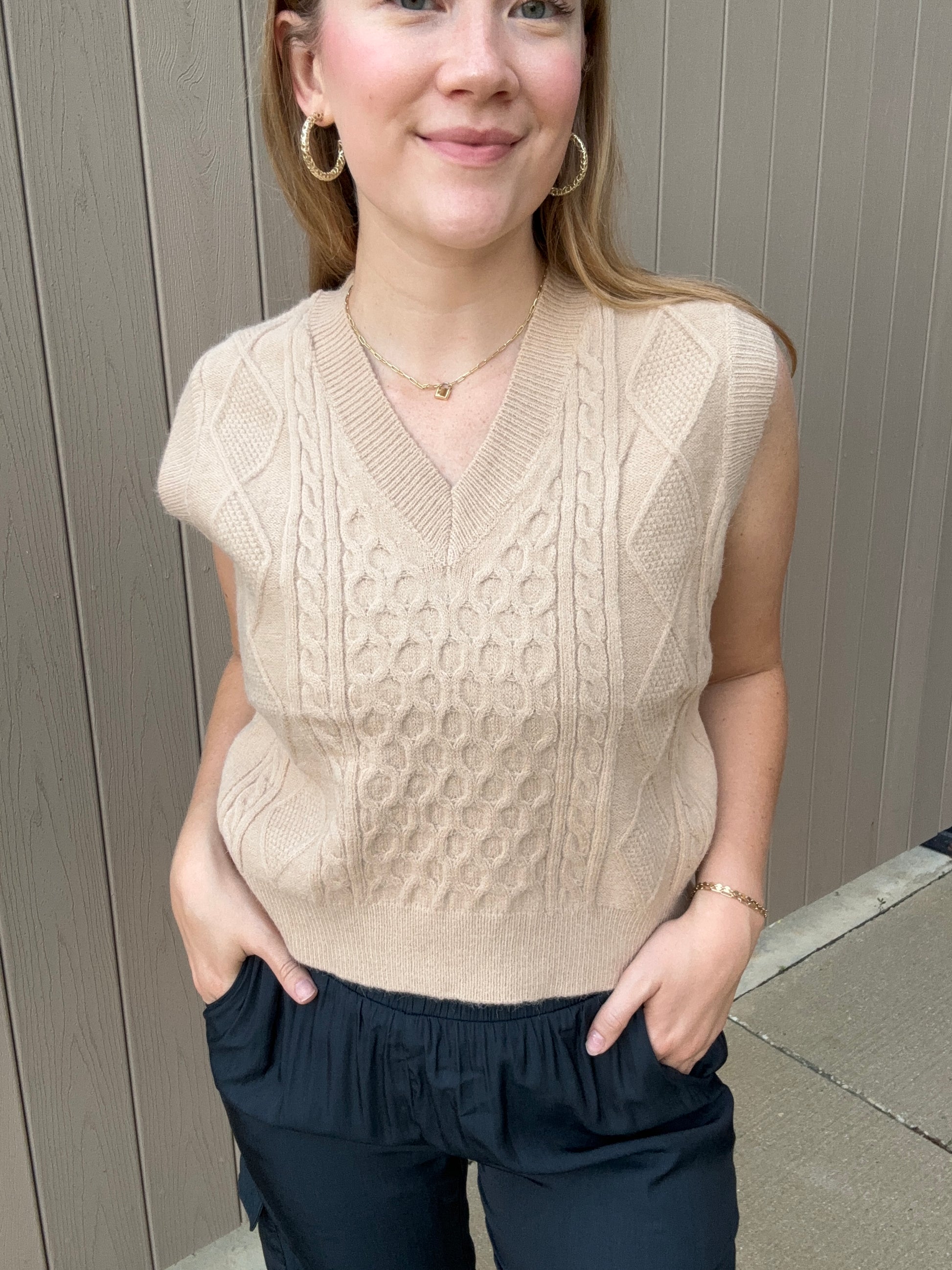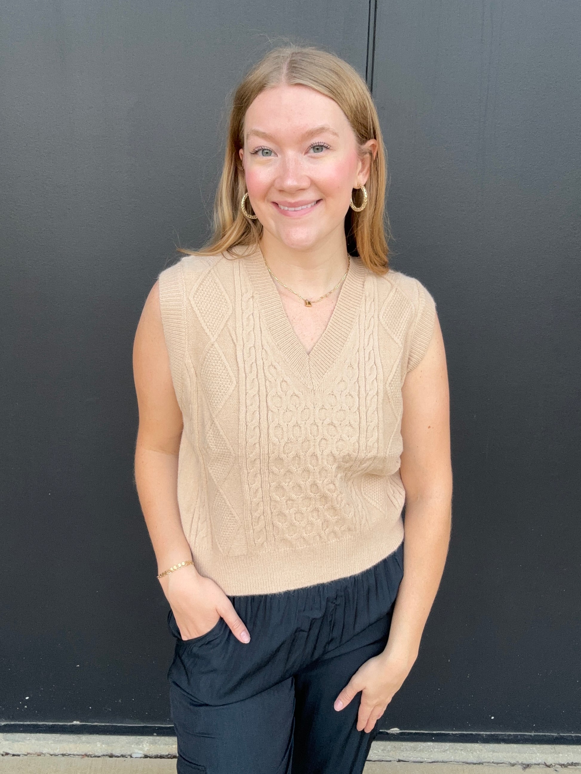 A cozy, trendy camel color sweater vest for fall, the perfect transition piece. This vest is soft, has cable knit pattern, v-neck fit and a side slit. Olivia paired it with our navy joggers and mules. Style for work or wear it trendy for a day out. Olivia is 5’8 wearing size small. Dry clean only.