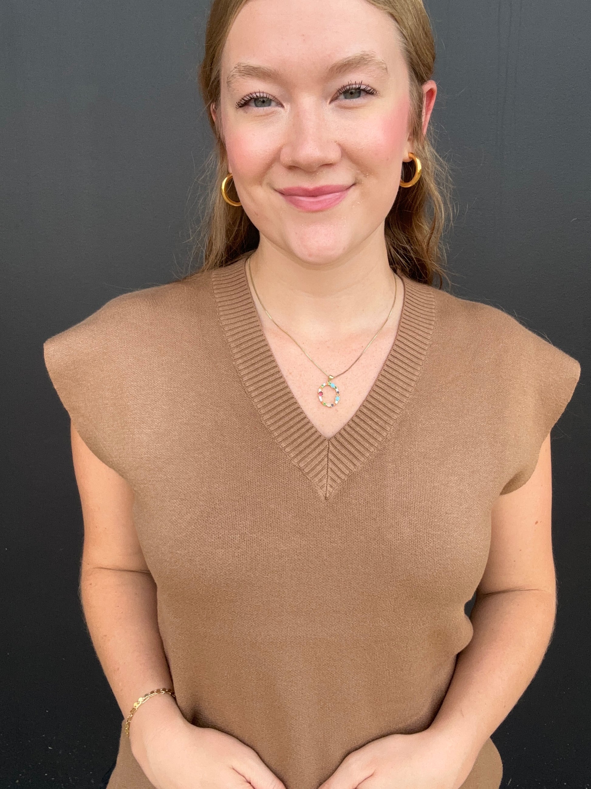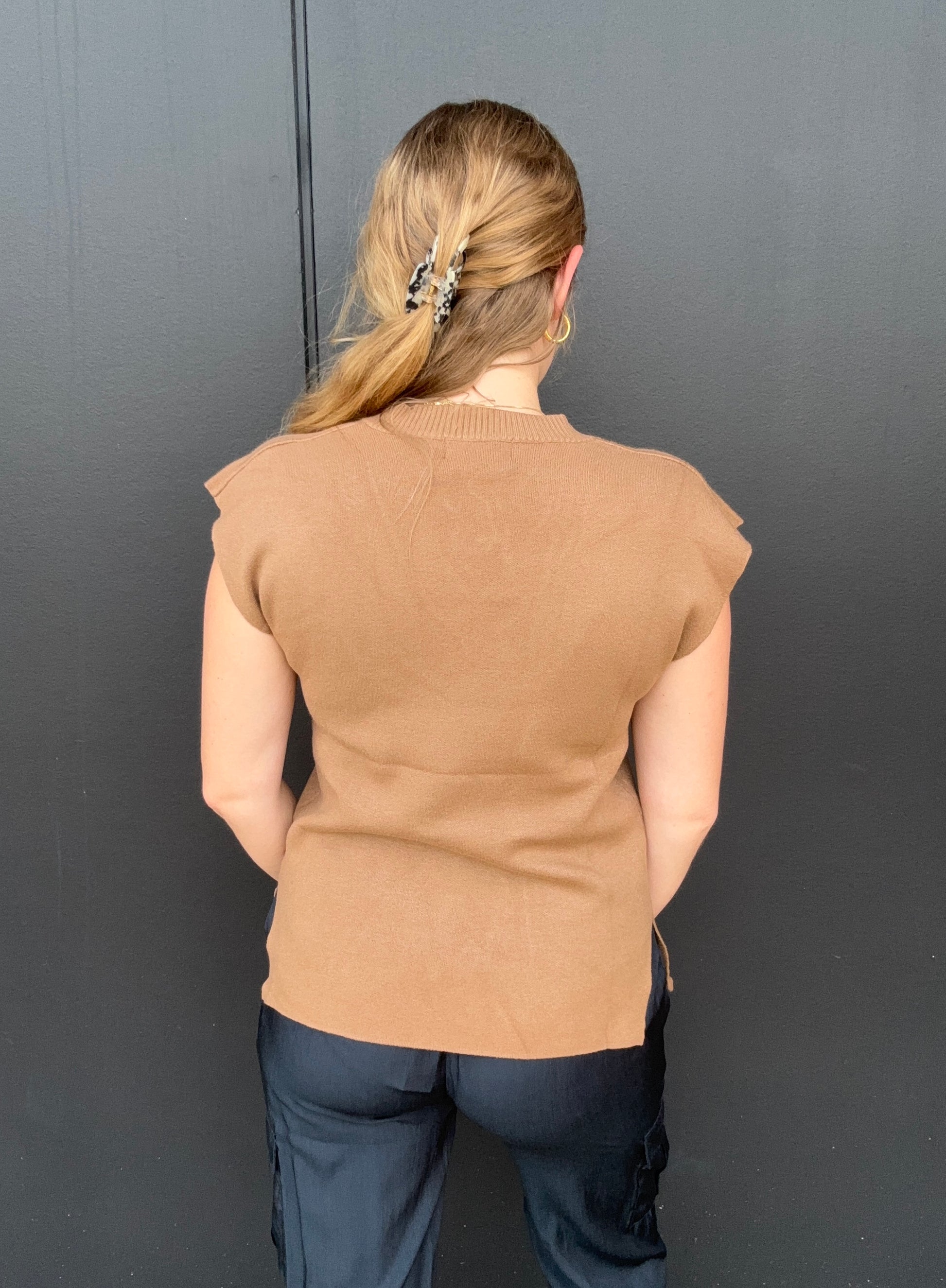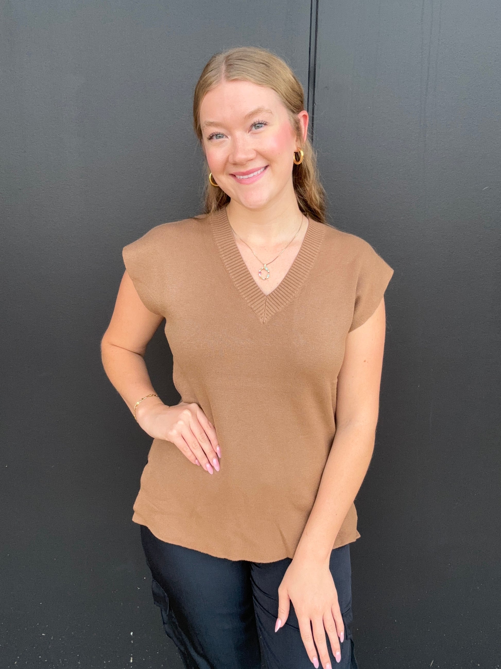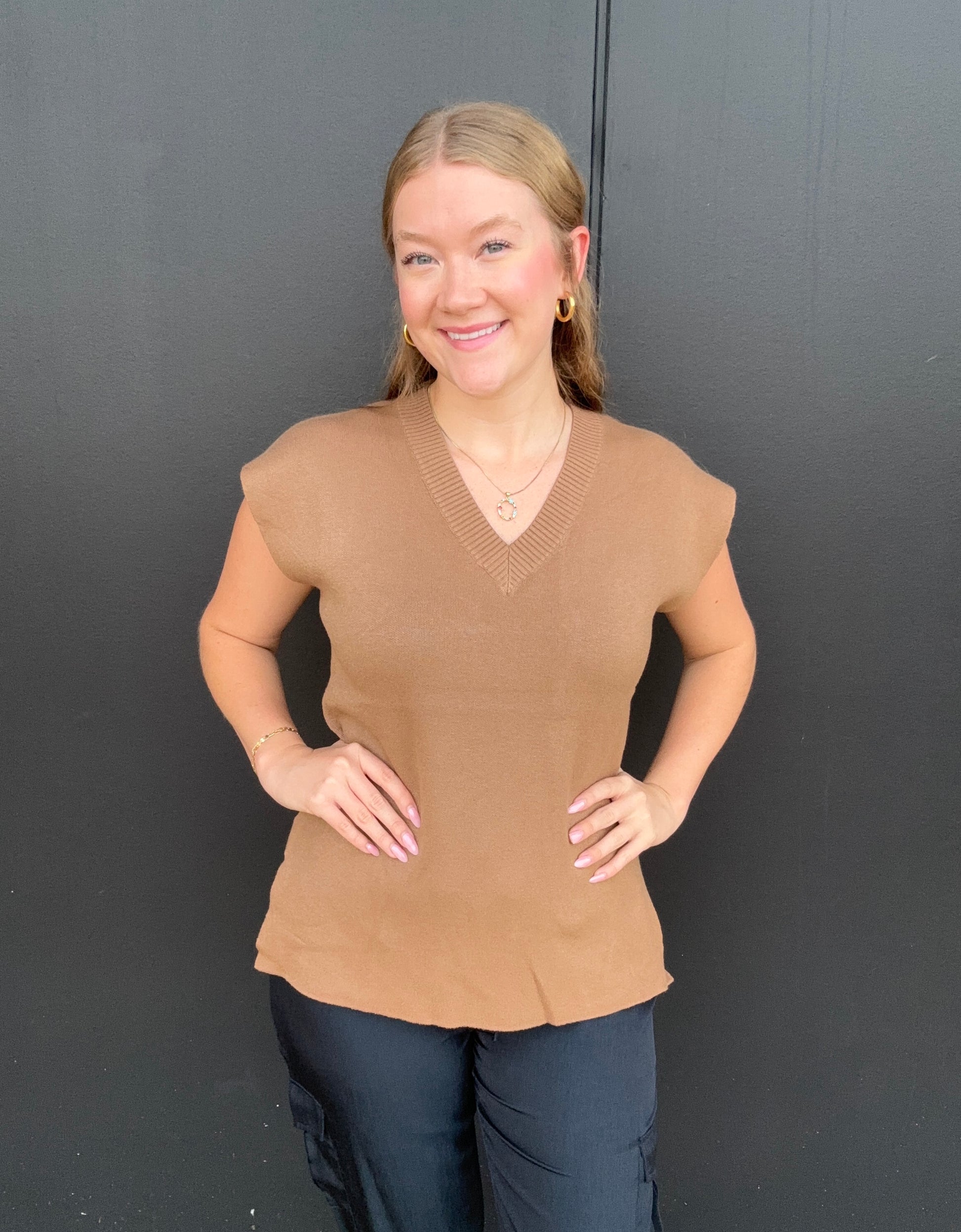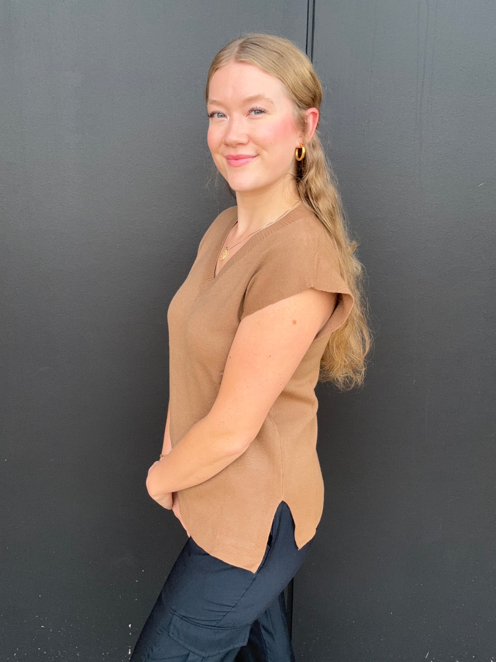 This buttery soft sweater vest top is a trendy piece you need in your fall wardrobe. Comes in a gorgeous camel color, v-neck, drop shoulder fit with a side slit. Pair with denim, cargo pants, or a skirt and some boots.