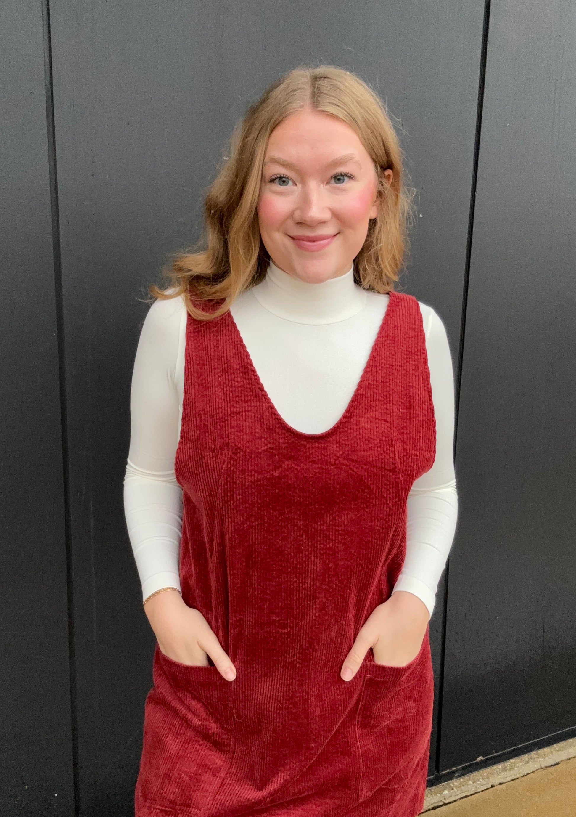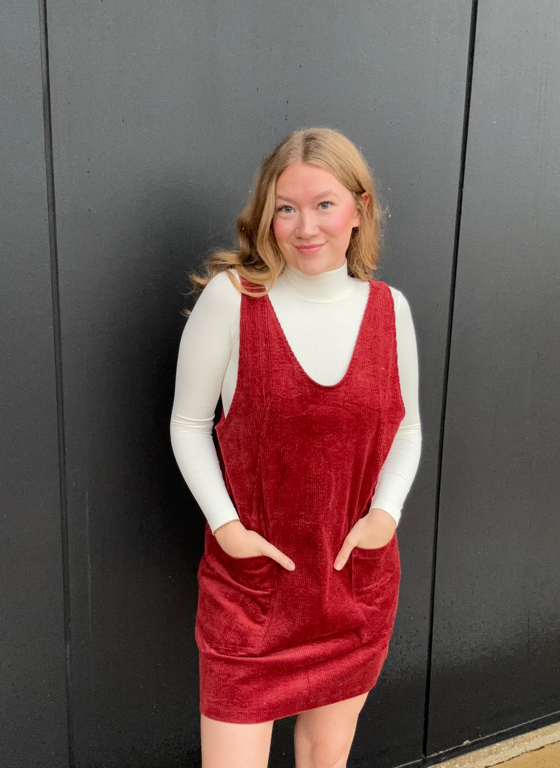 The most gorgeous overall corduroy dress for holidays, date night, work, and events. This relaxed fit dress has a scoop neckline, overall fit, adjustable straps, and front pockets. Pair over a fitted shirt as pictured or later over a sweater and add your favorite boots. Comes in a gorgeous burgundy color, perfect for fall and winter. Made from 98% cotton 2% spandex. Recommend to size down as it has an oversized fit, Olivia is 5'8 wearing size small.Â