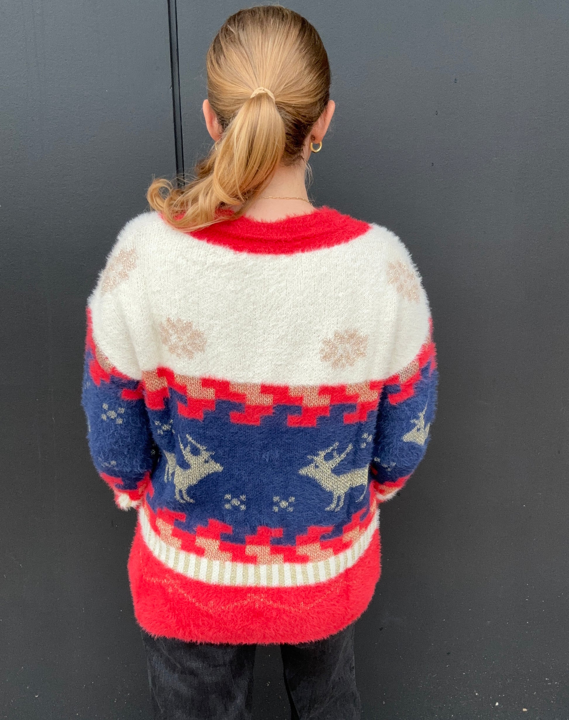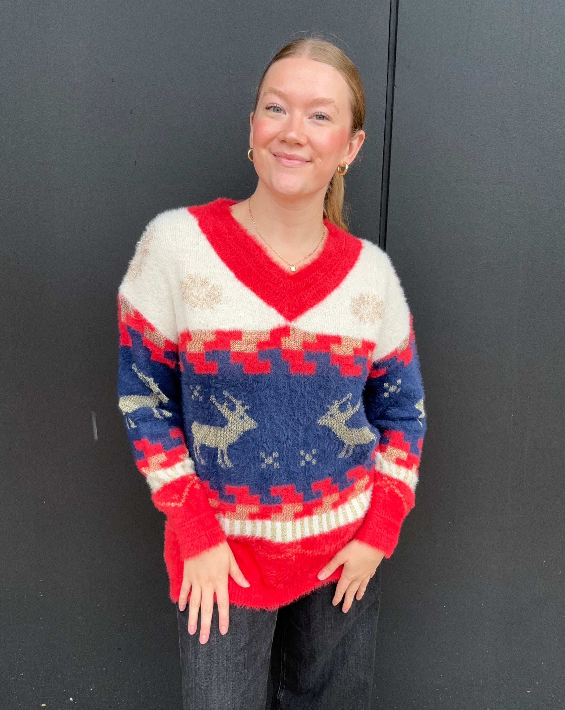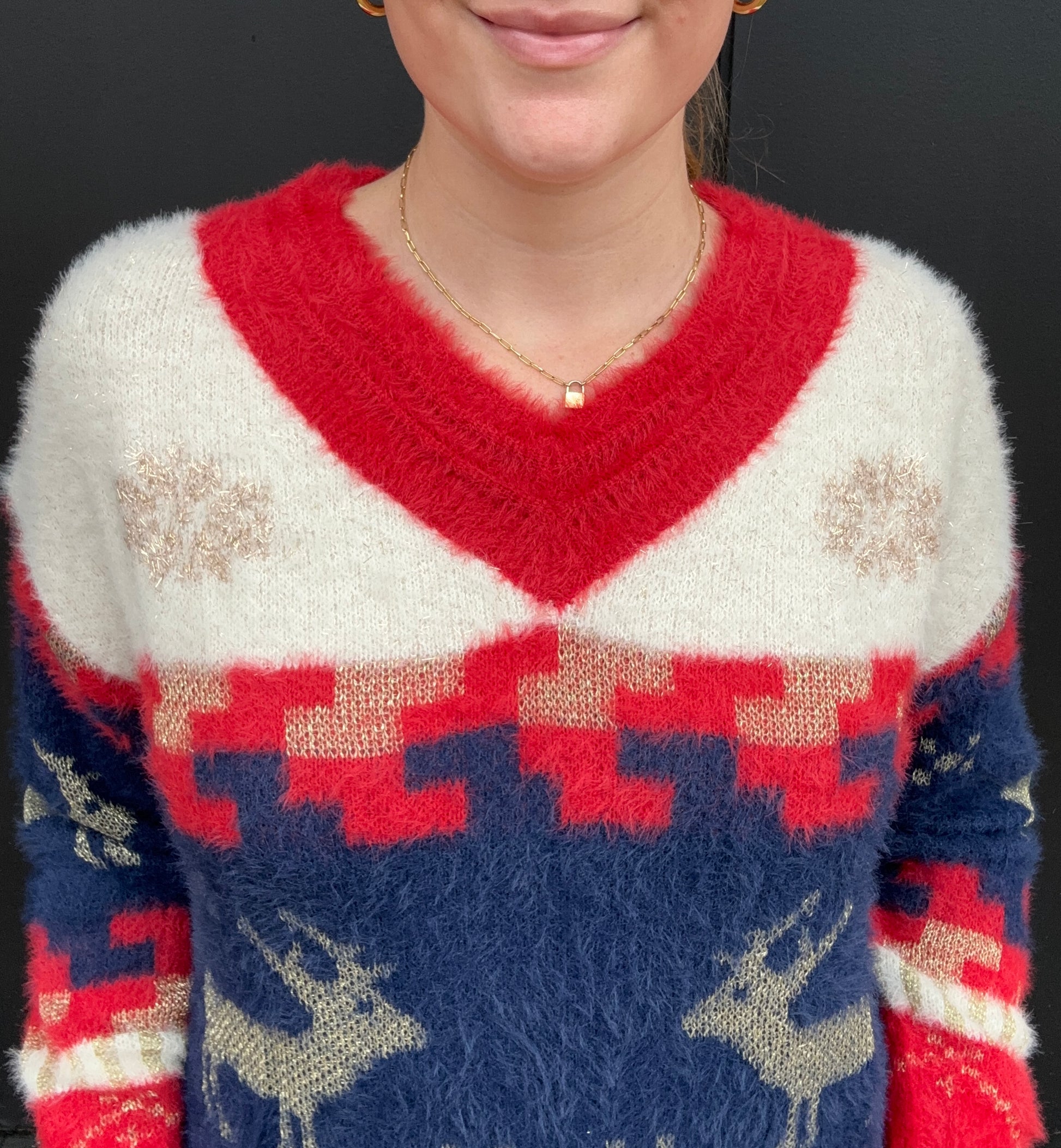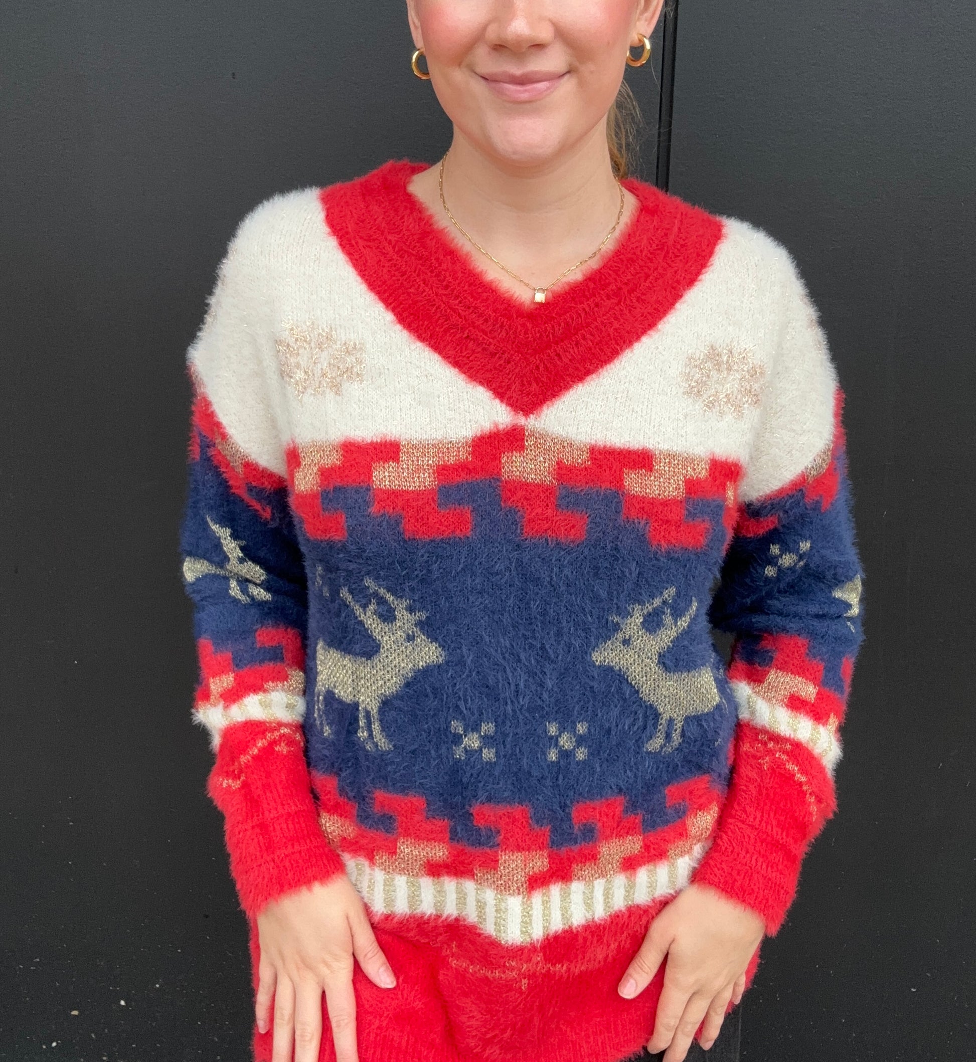 Your not so ugly Christmas sweater! This festive, fuzzy sweater features snowflakes, reindeers, and classic vintage Christmas colors - red, ivory, blue and, gold. The reindeer and snowflakes are sparkly gold. V-neck fit with a sinched neckline and cuff sleeves. Super cozy and perfect for holiday parties or family gatherings! Longer length. Olivia is 5'8 wearing size small.Â