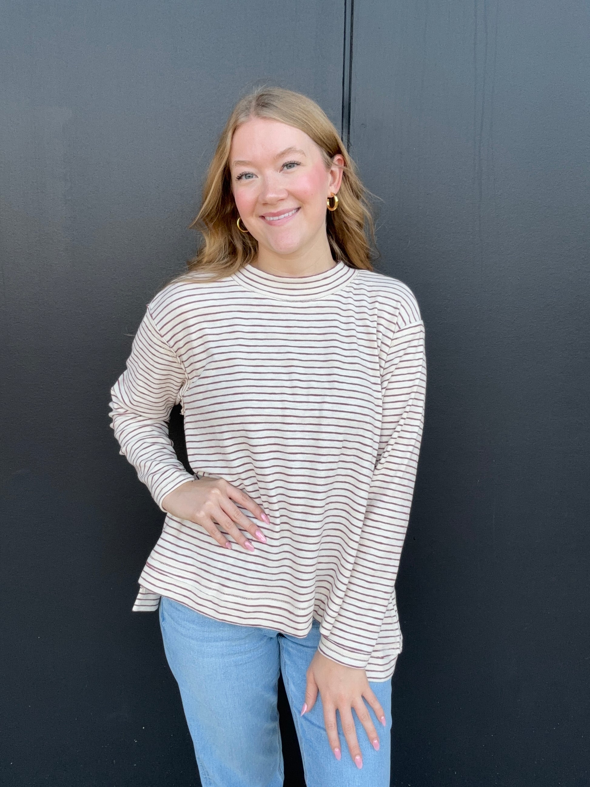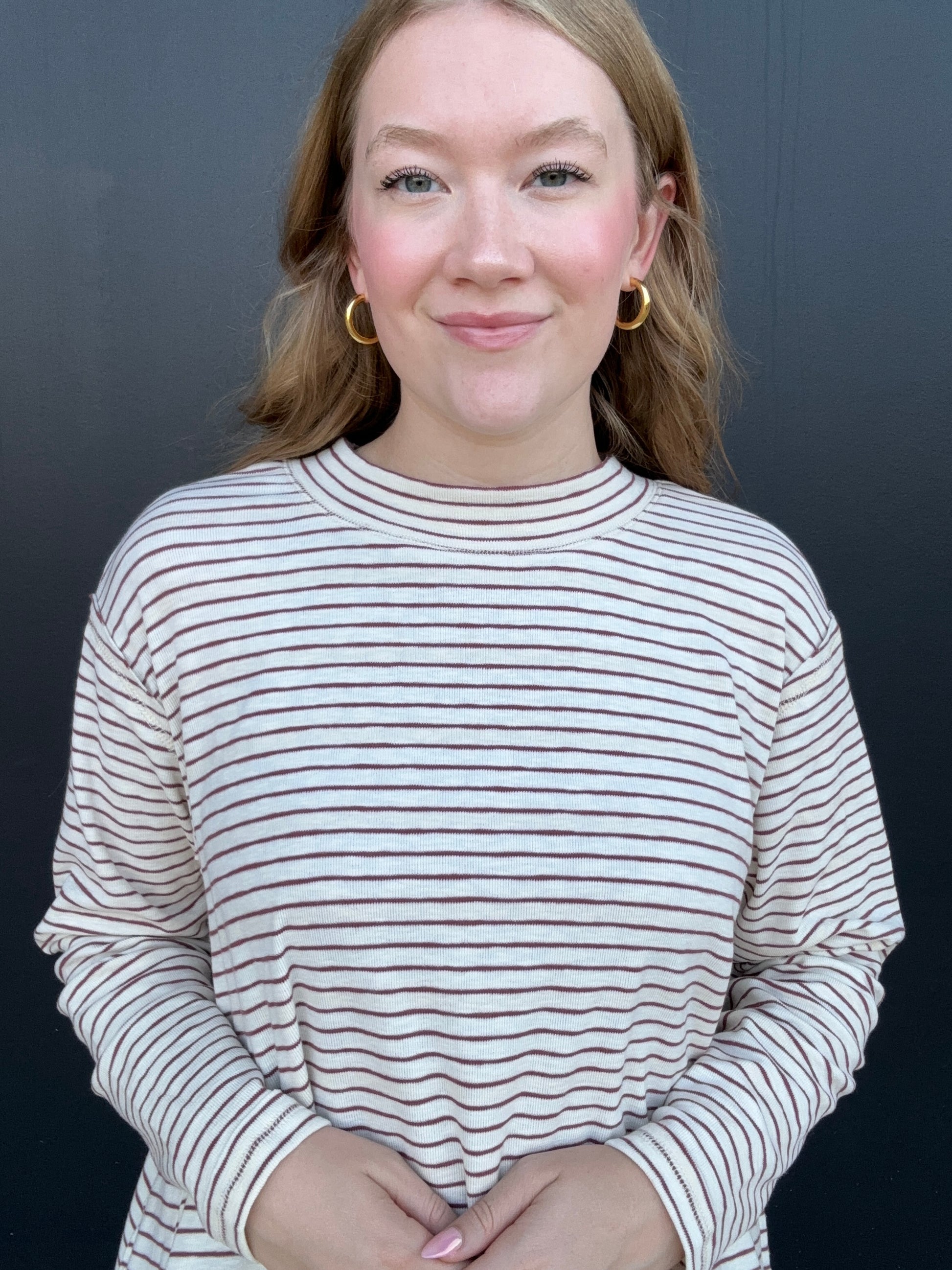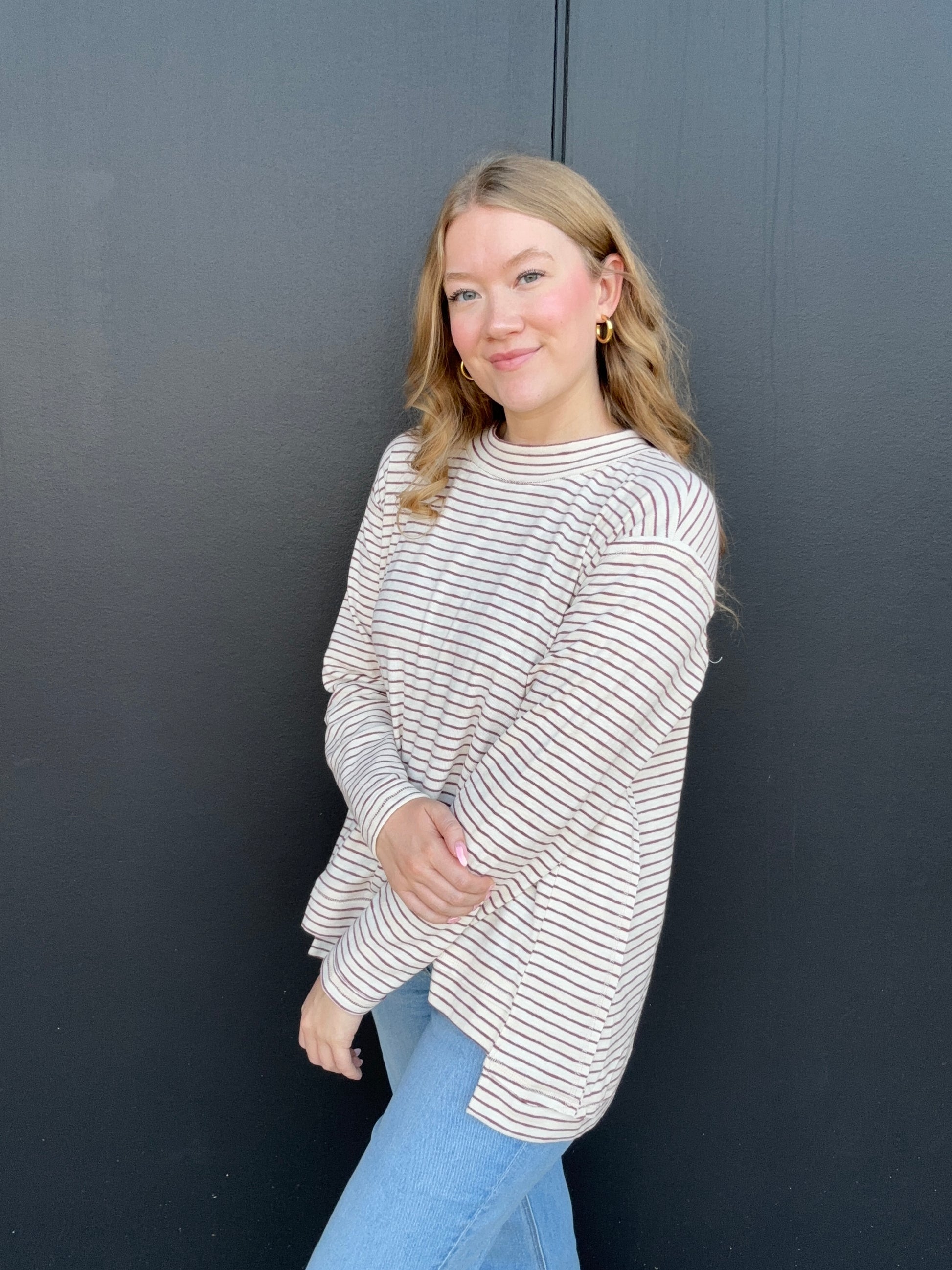 Introducing a laid-back and chic crewneck slouchy stripe top that effortlessly combines comfort with modern style. This top features a relaxed, oversized fit and a flowy silhouette, allowing for easy movement and a casual yet fashionable look. The crewneck adds a classic touch, while the slouchy design adds an element of relaxed elegance.Â