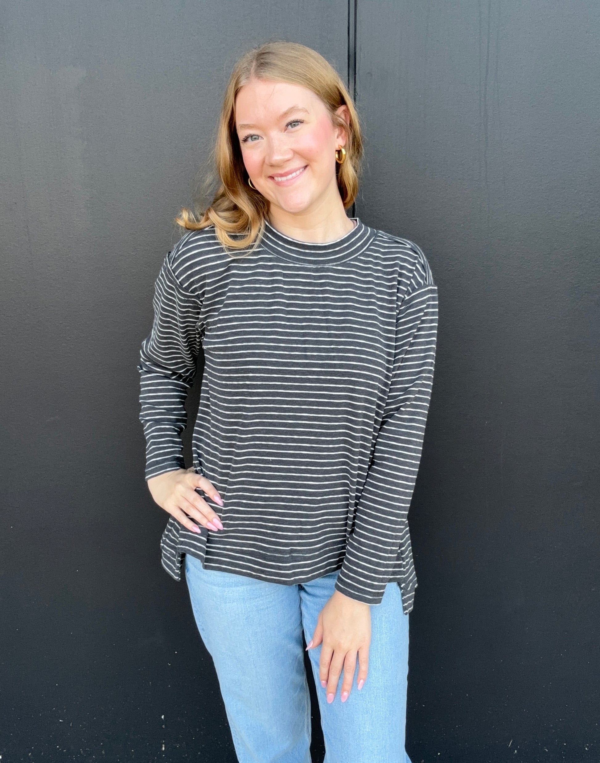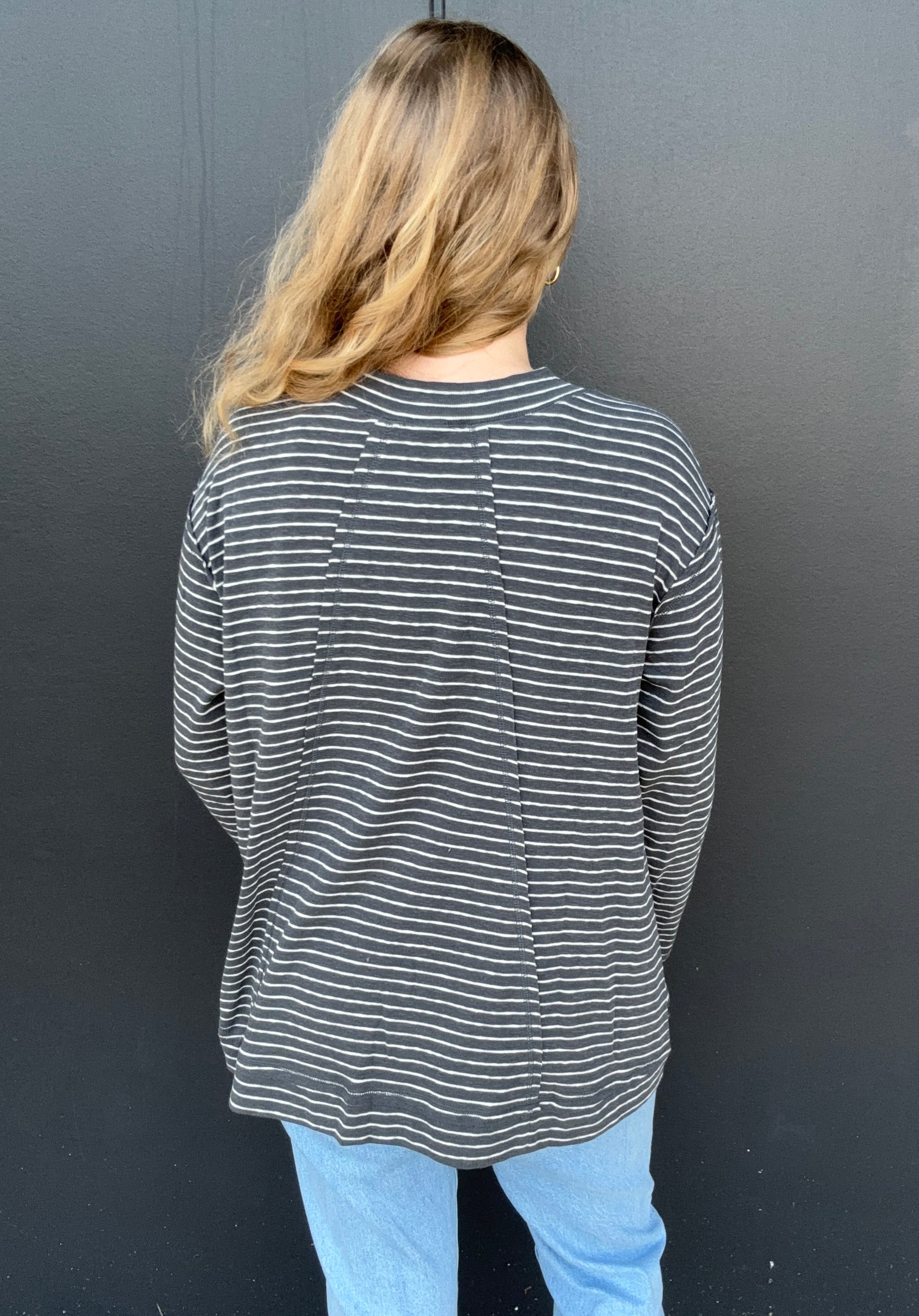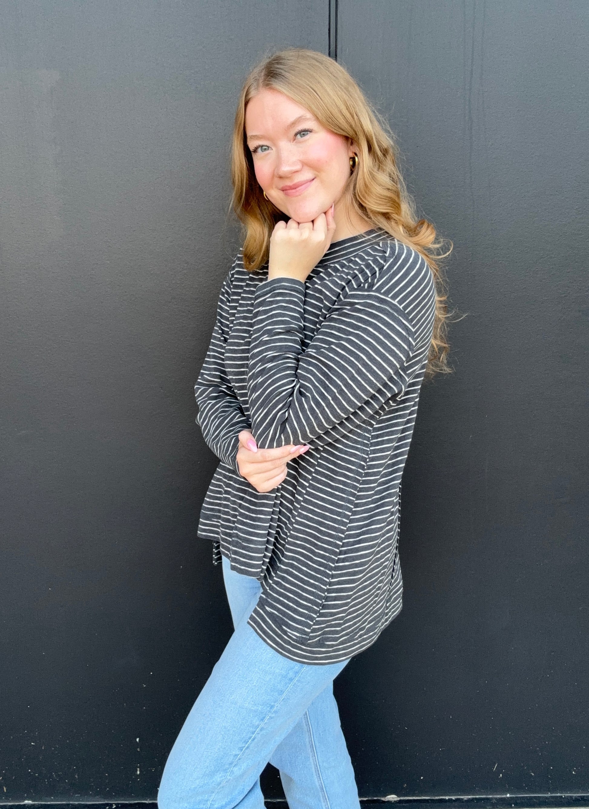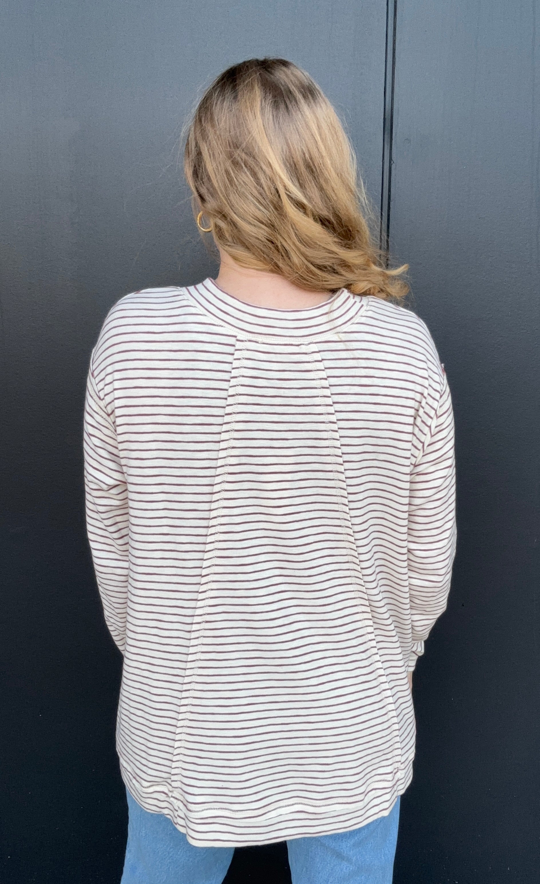 Introducing a laid-back and chic crewneck slouchy stripe top that effortlessly combines comfort with modern style. This top features a relaxed, oversized fit and a flowy silhouette, allowing for easy movement and a casual yet fashionable look. The crewneck adds a classic touch, while the slouchy design adds an element of relaxed elegance.Â