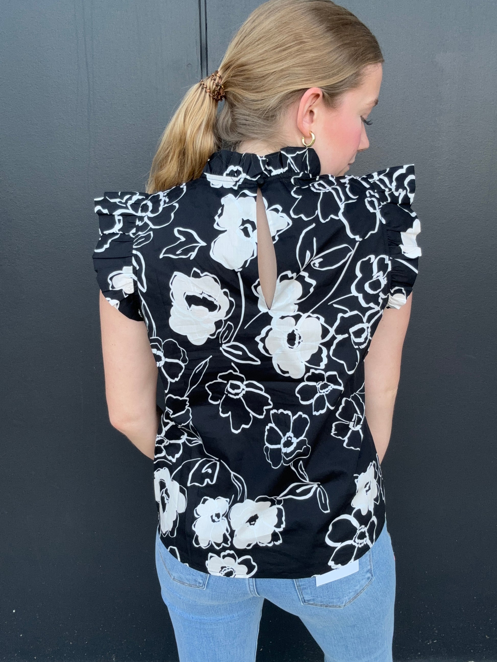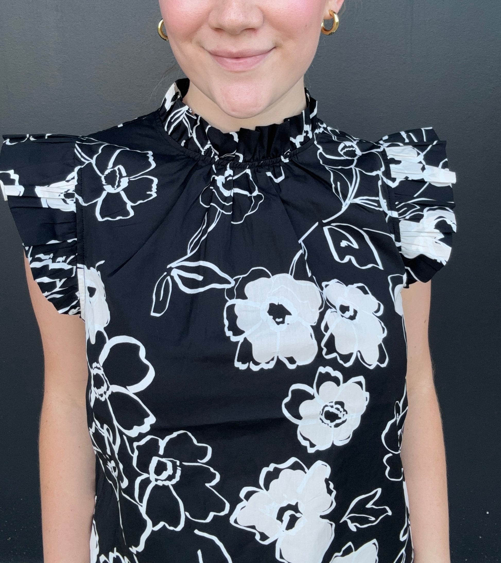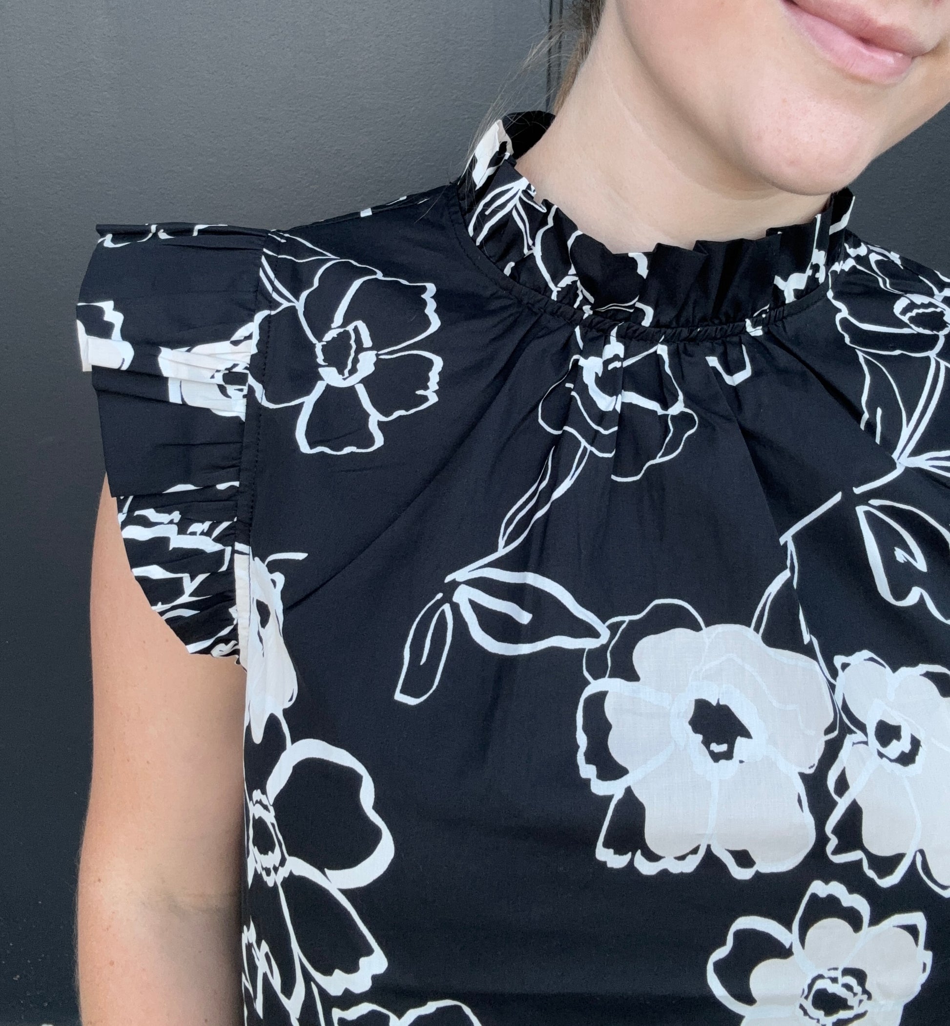 Nothing more classic than a black and cream blouse. Made of a cool, breathable poplin. A high, ruffle neck is framed by ruffle cap sleeves and maintains a standard fit. Wear it tucked into white denim pants or denim, paired with strappy sandals for an effortless summer look. 100% cotton.