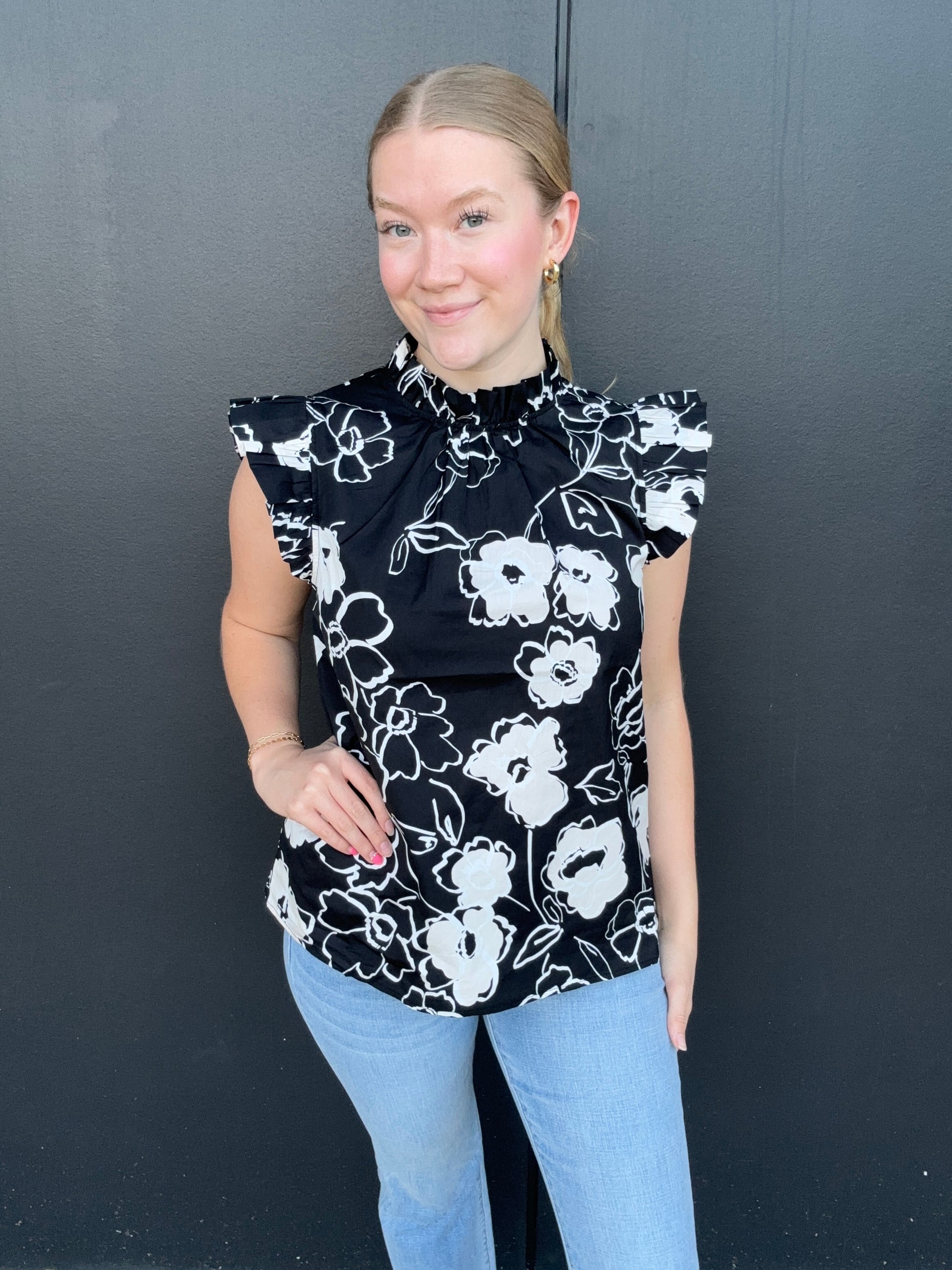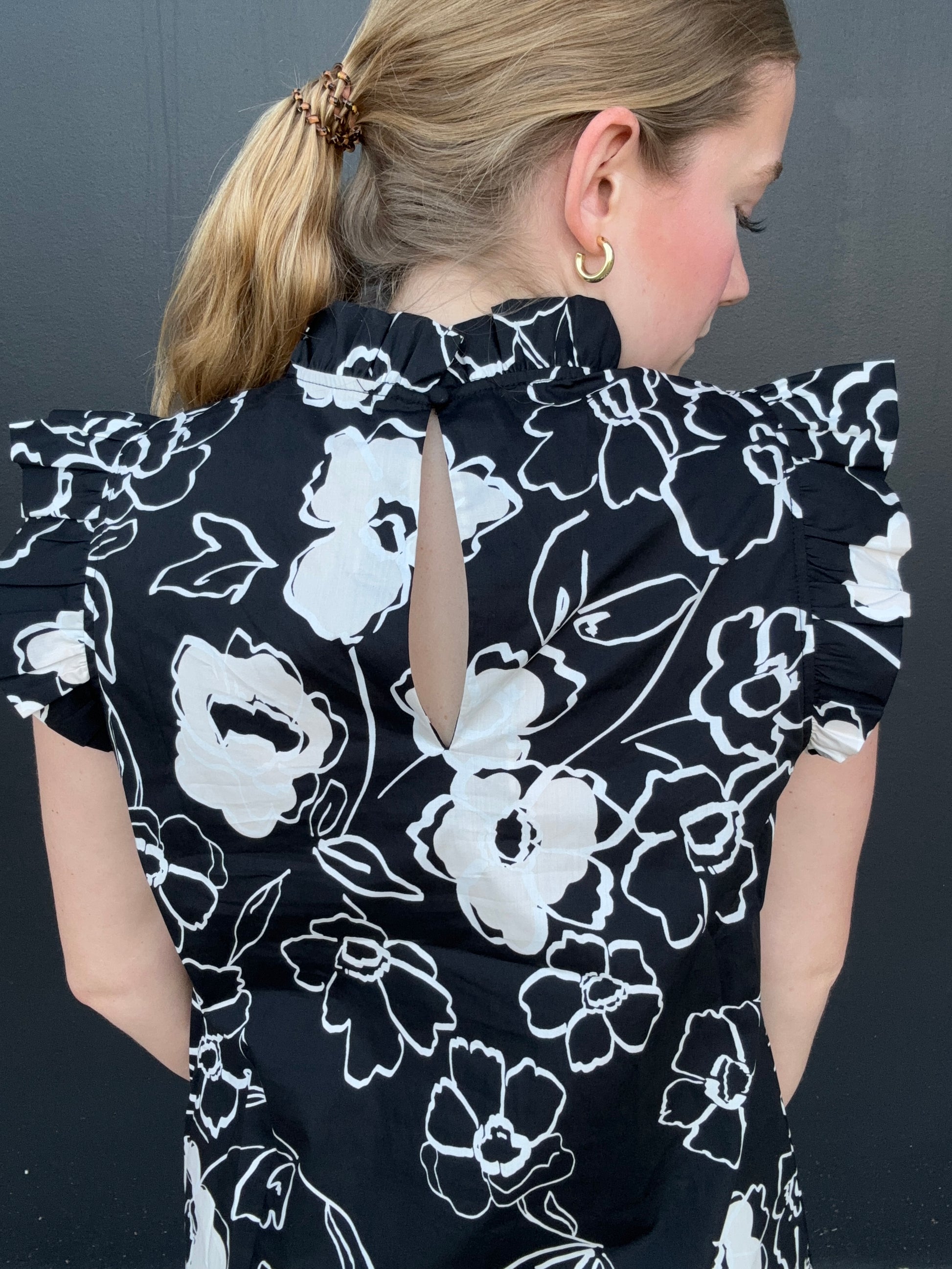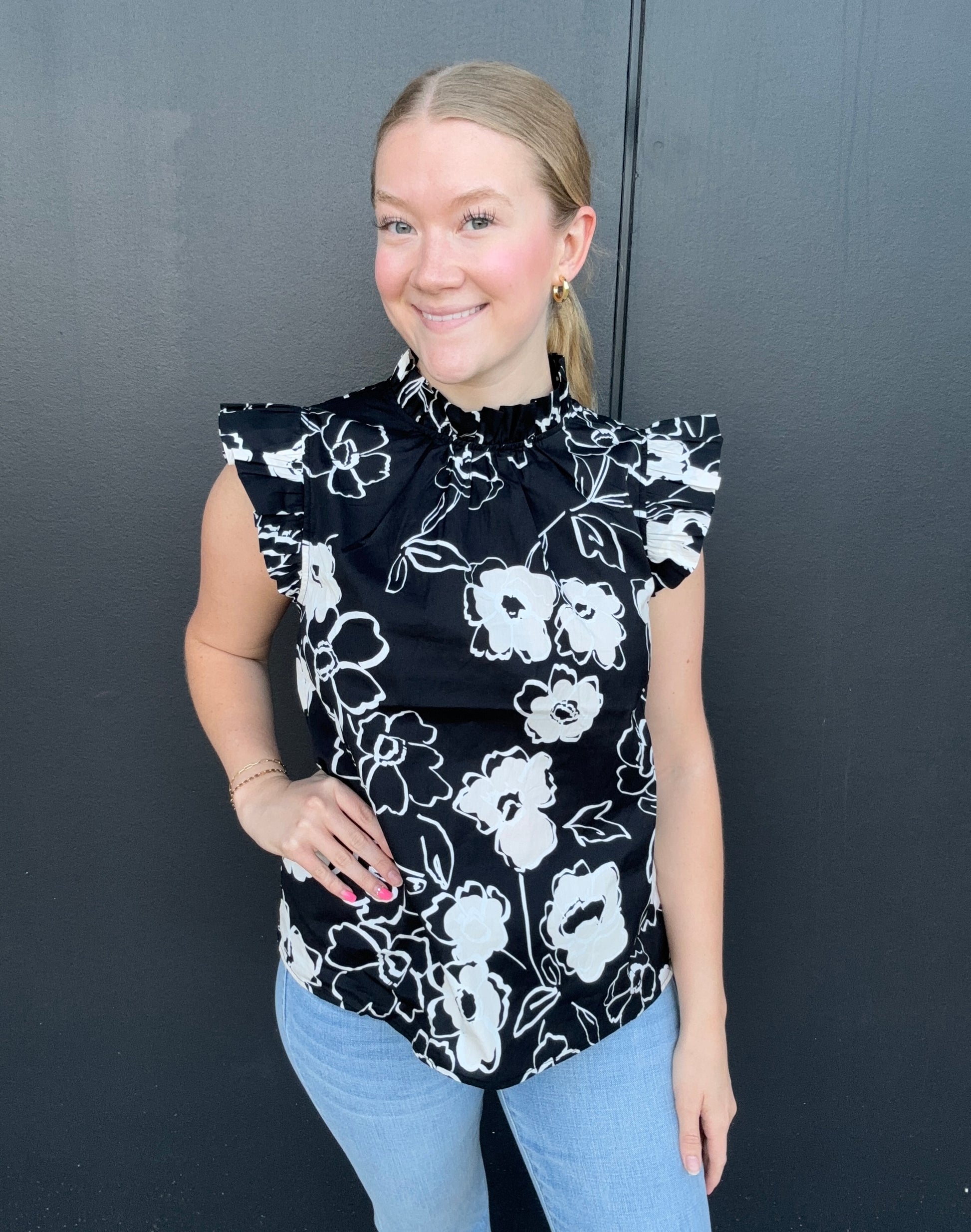 Nothing more classic than a black and cream blouse. Made of a cool, breathable poplin. A high, ruffle neck is framed by ruffle cap sleeves and maintains a standard fit. Wear it tucked into white denim pants or denim, paired with strappy sandals for an effortless summer look. 100% cotton.