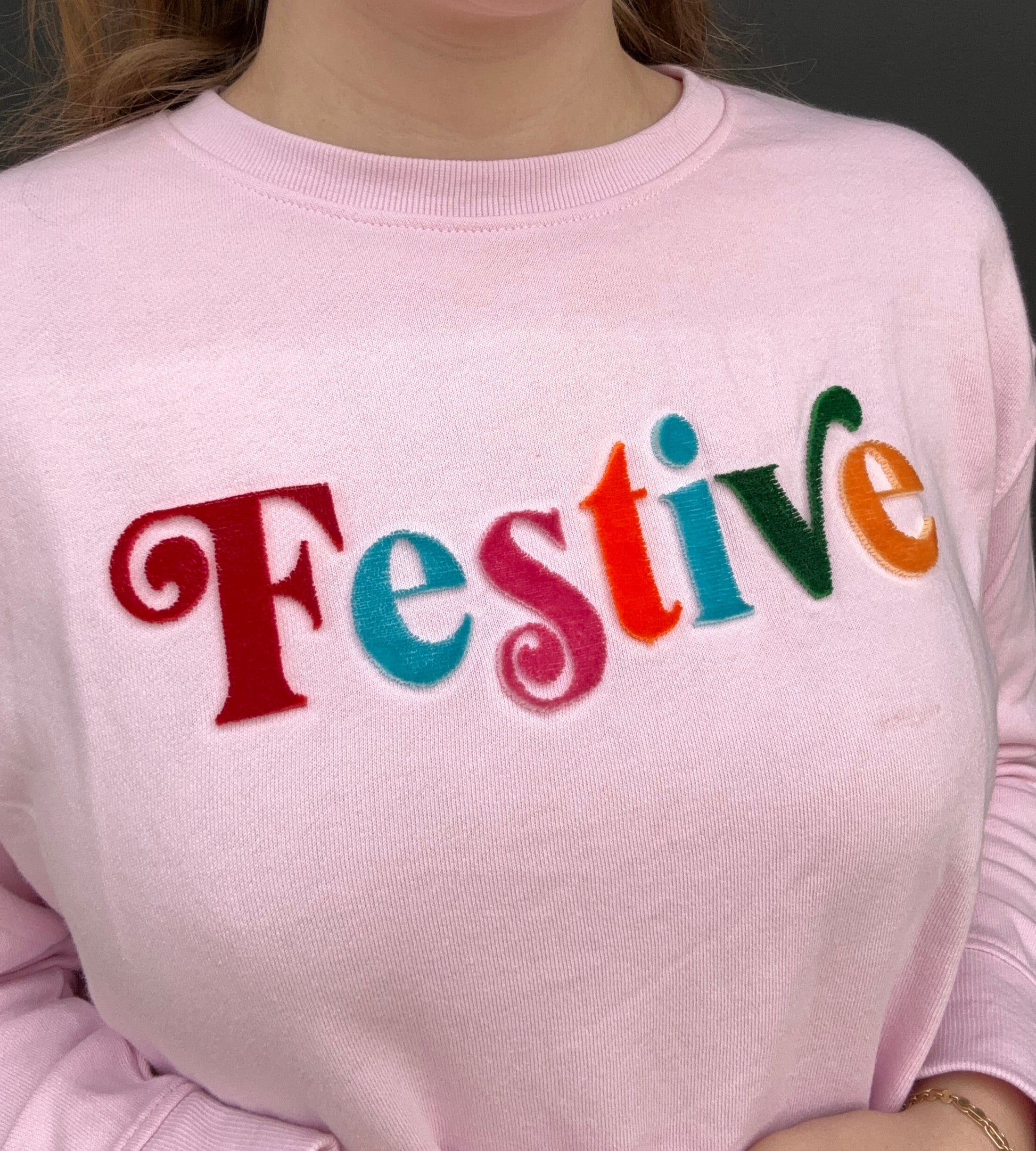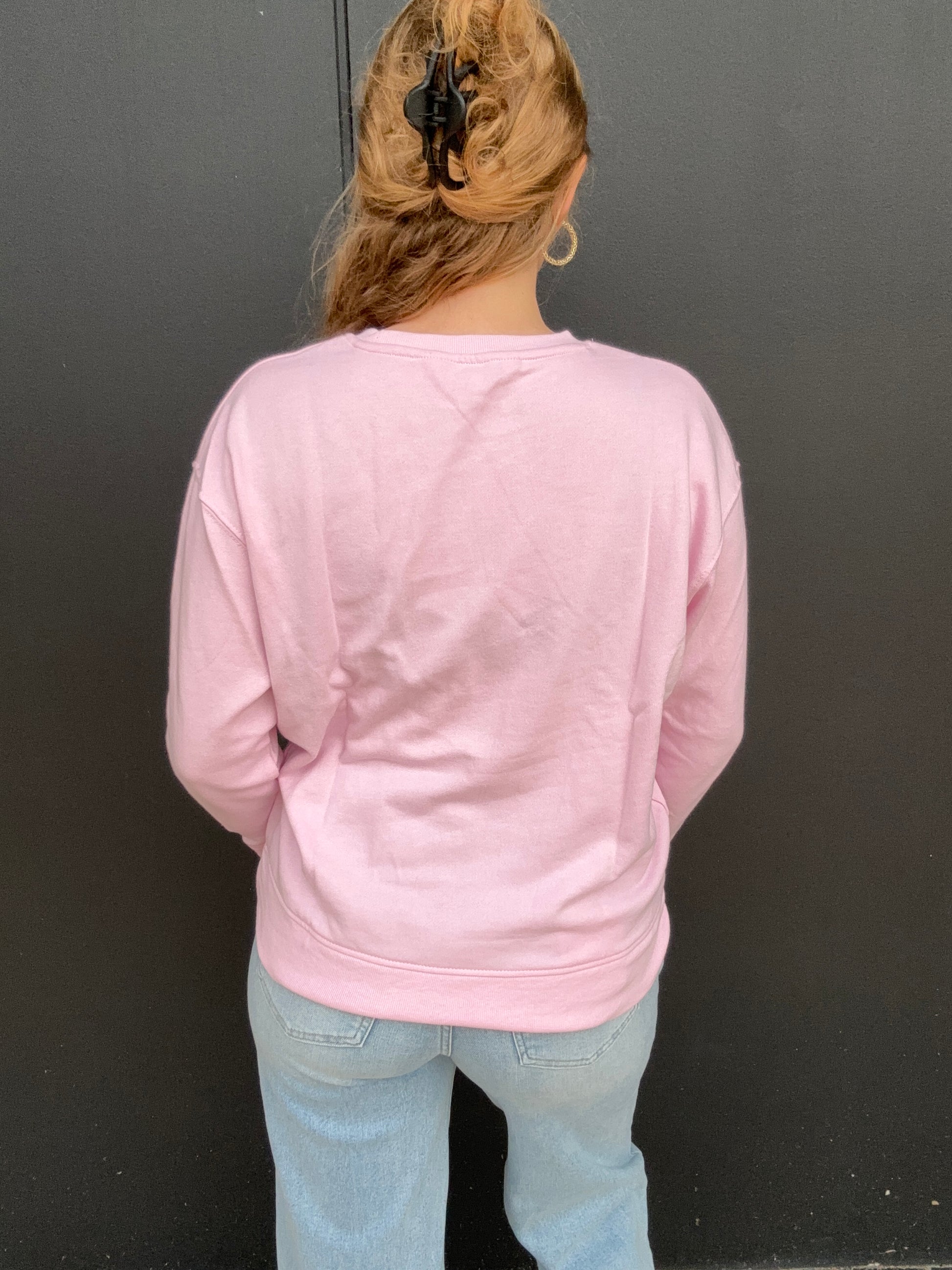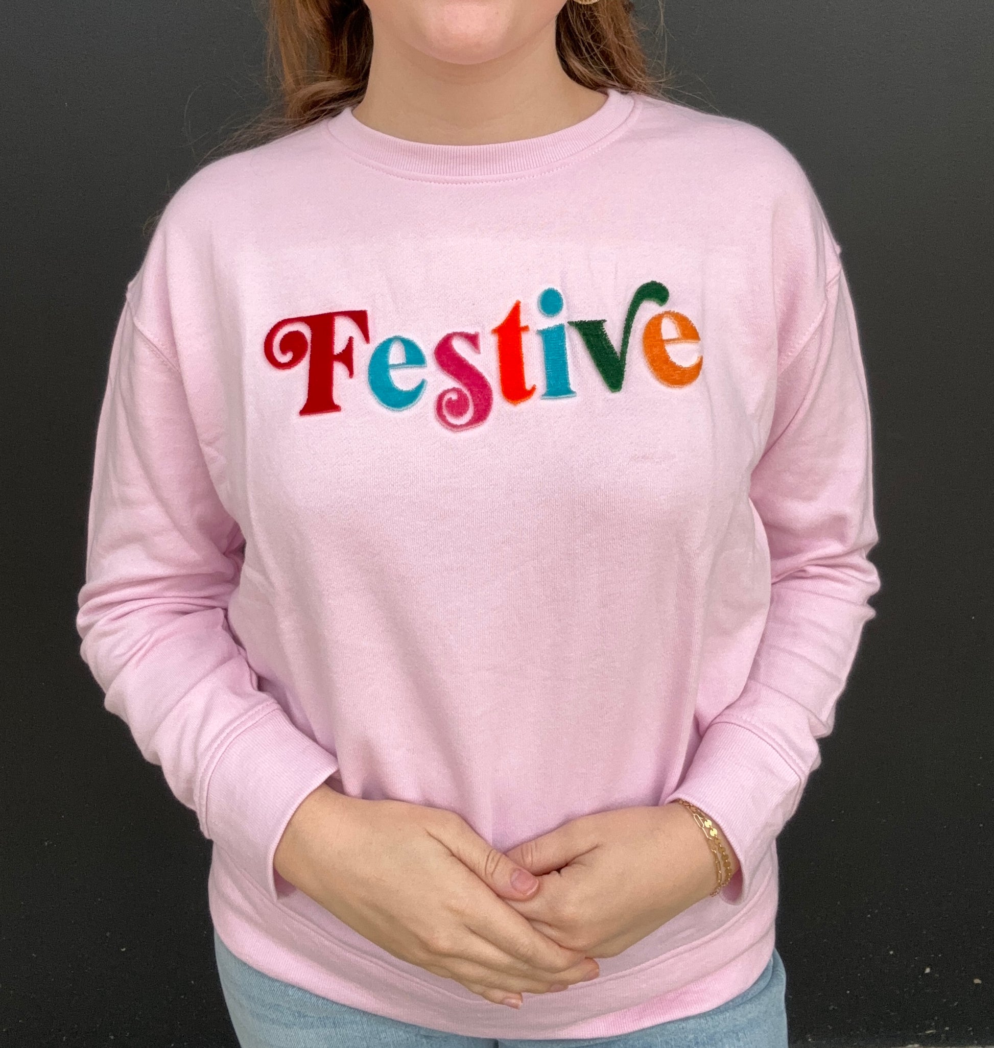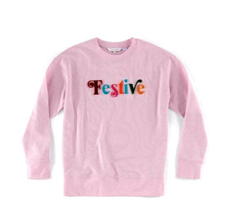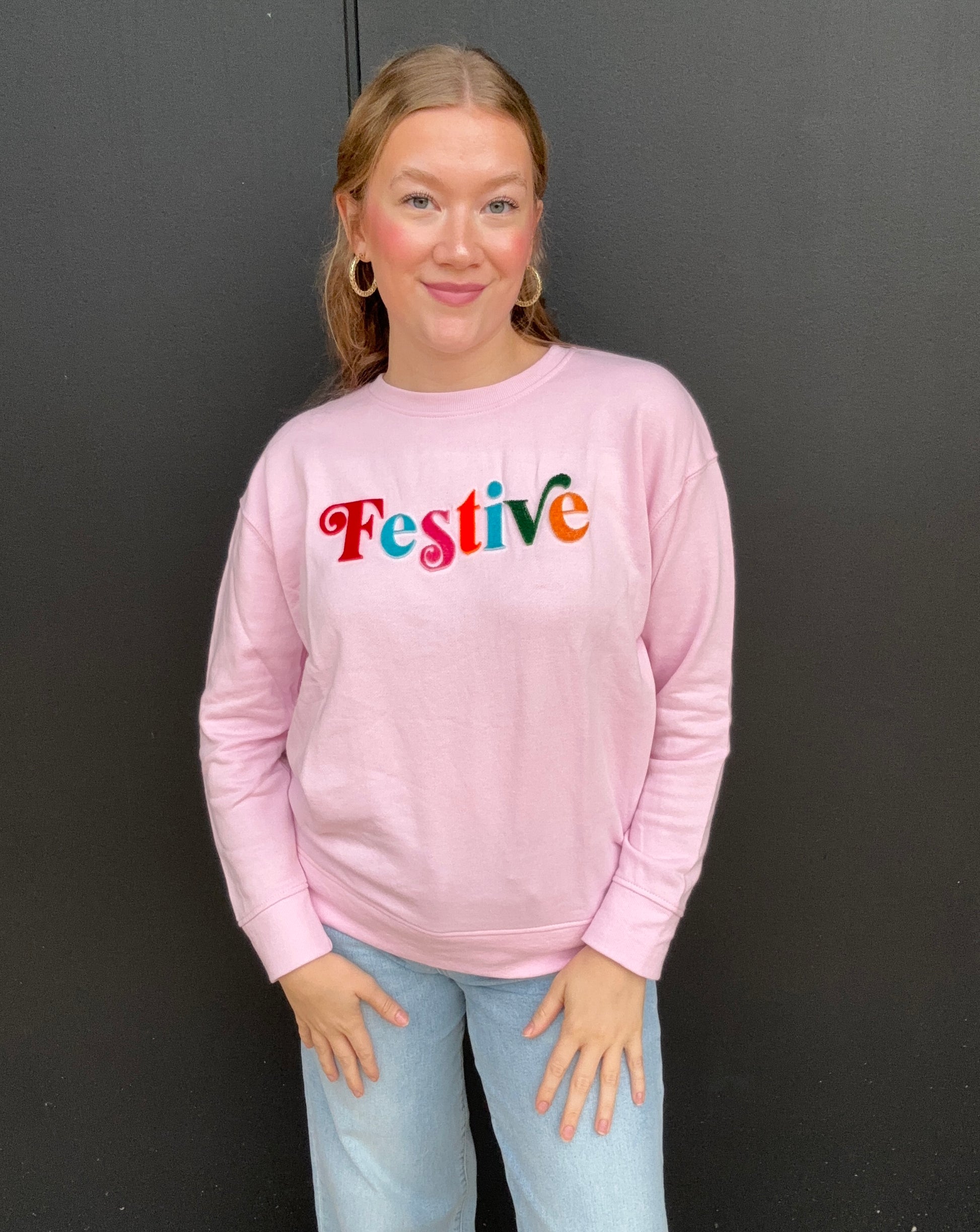Celebrate the holiday season with this Festive Sweatshirt in a delicate blush shade. Crafted from a blend of cotton and polyester, ensuring comfort and durability. Designed for the fall/winter season, this sweatshirt is a perfect addition to your wardrobe, offering a cozy feel and a stylish look. It's more than just a piece of clothing, it's a thoughtful gift that makes you feel good! Olivia is 5'8 wearing size medium.Â