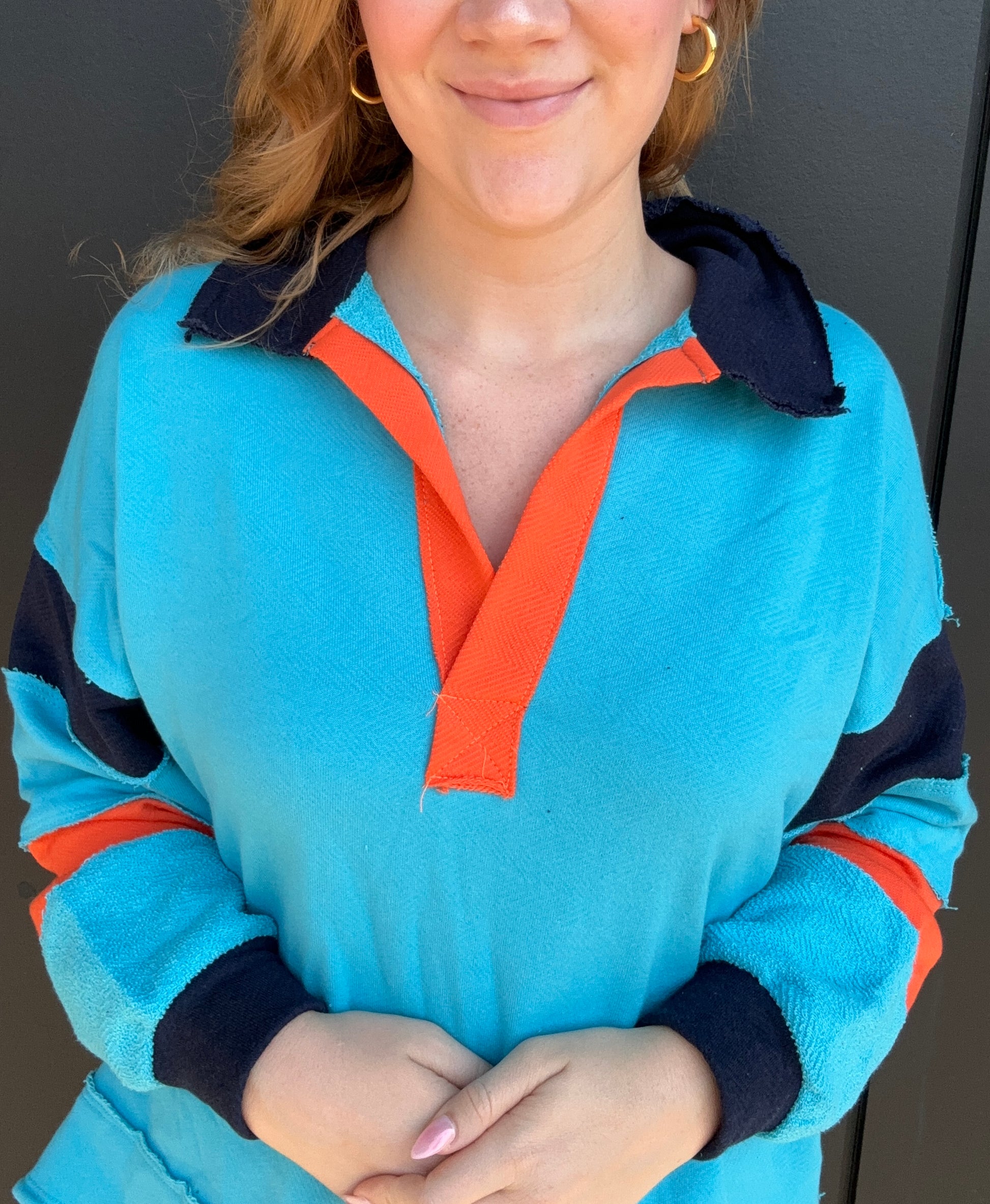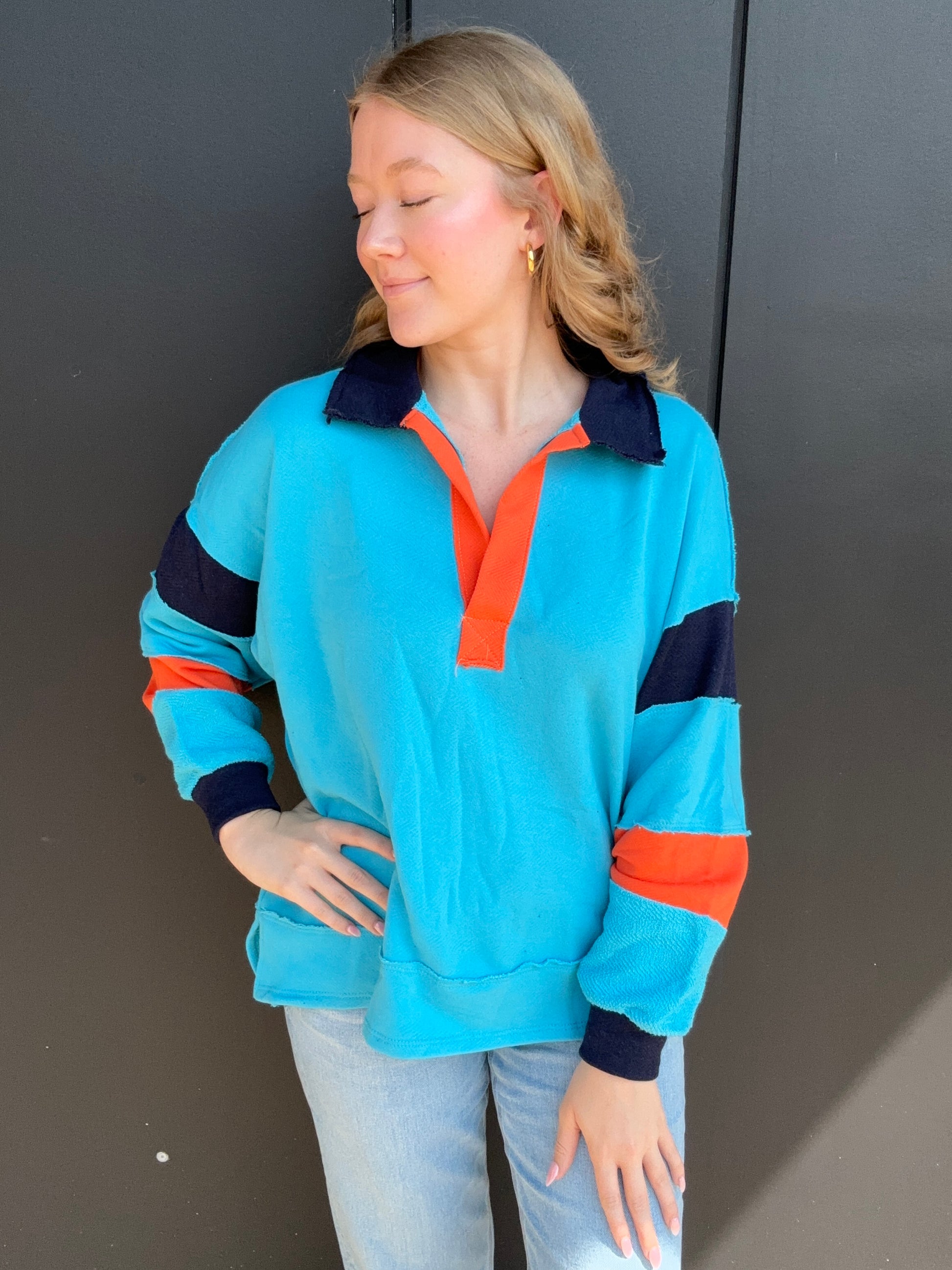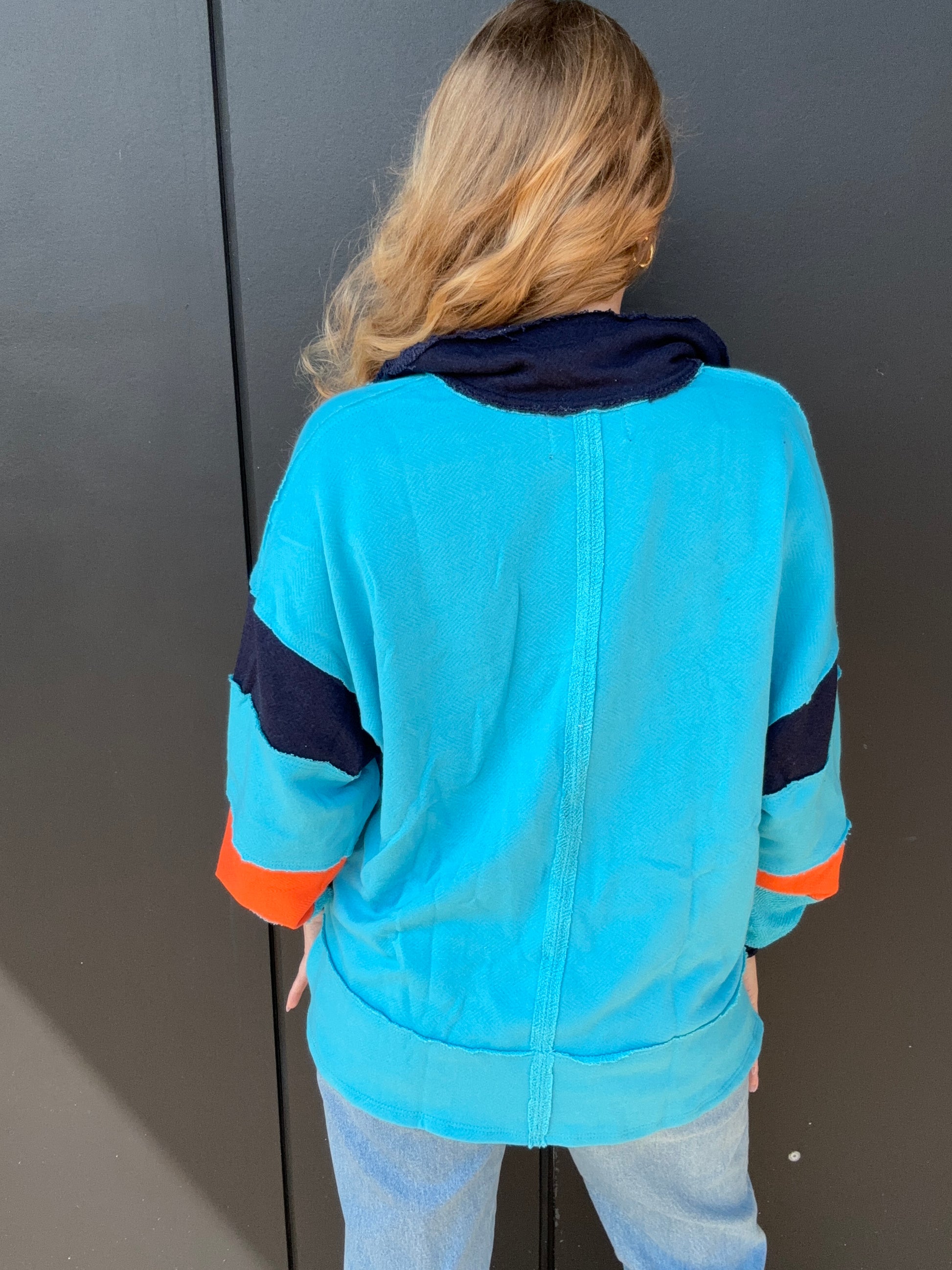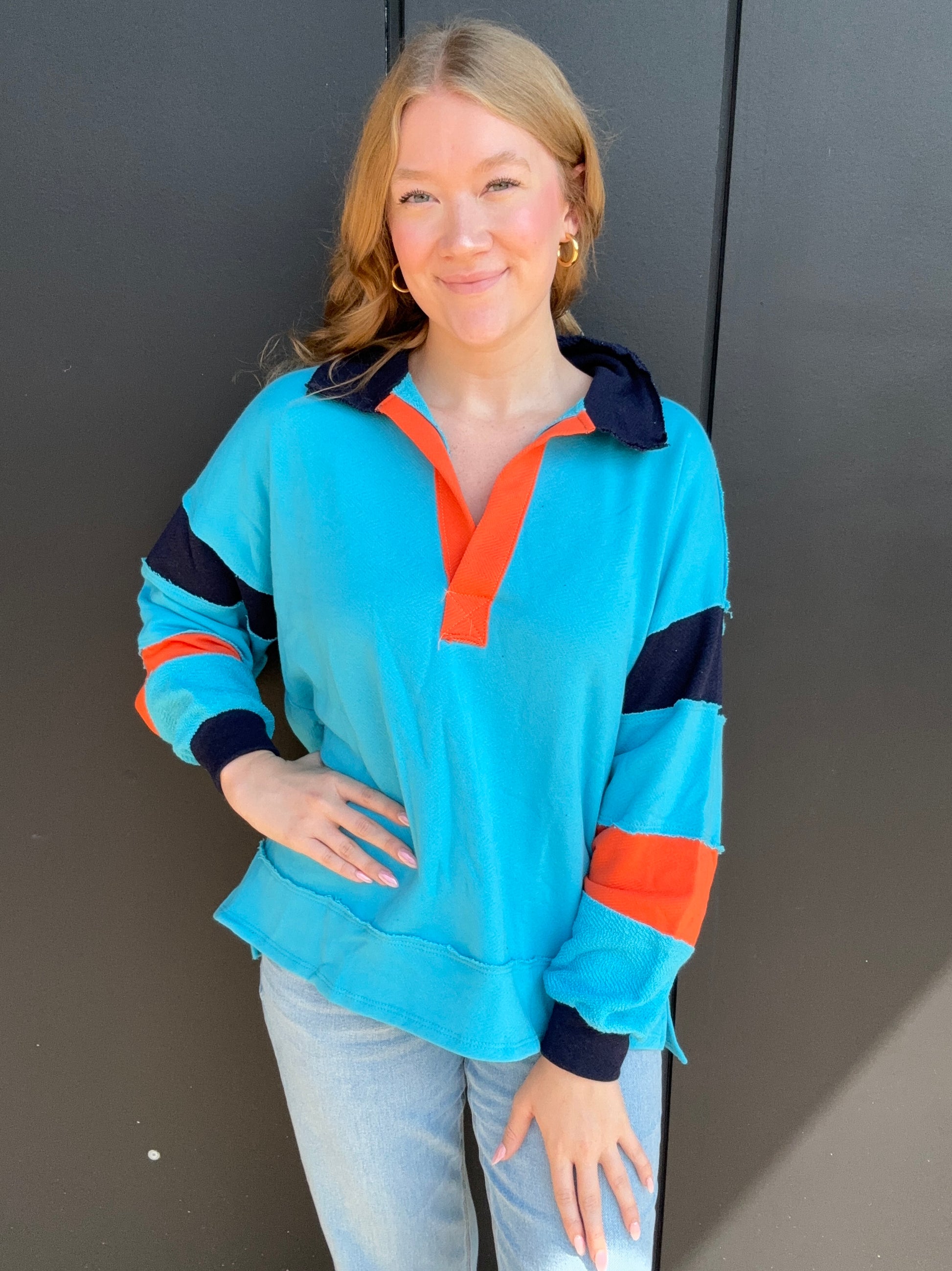 Your perfect oversized, comfy top for fall and winter time. The light blue, orange, and navy color block makes it perfect for Illinois games and tailgates. This loose fit top features a big collar, long dolman sleeves, and raw edge detailing. Pair with denim and boots or navy leggings and cute sneakers. Recommend to hand wash, 100% cotton,