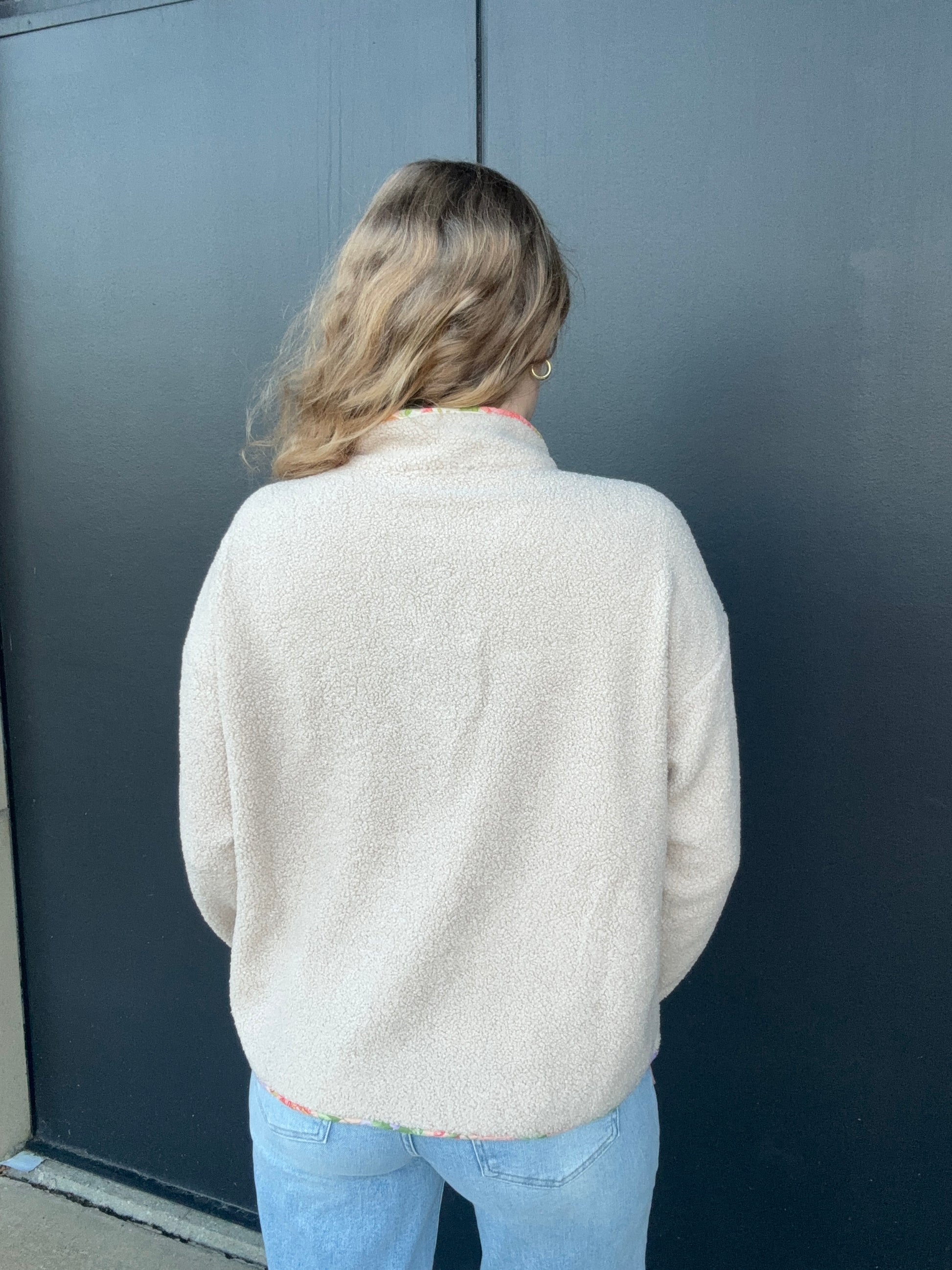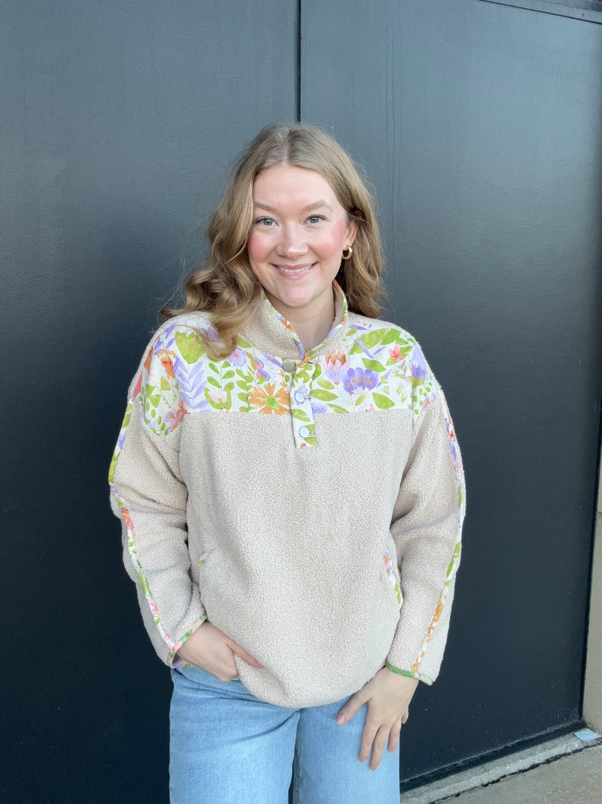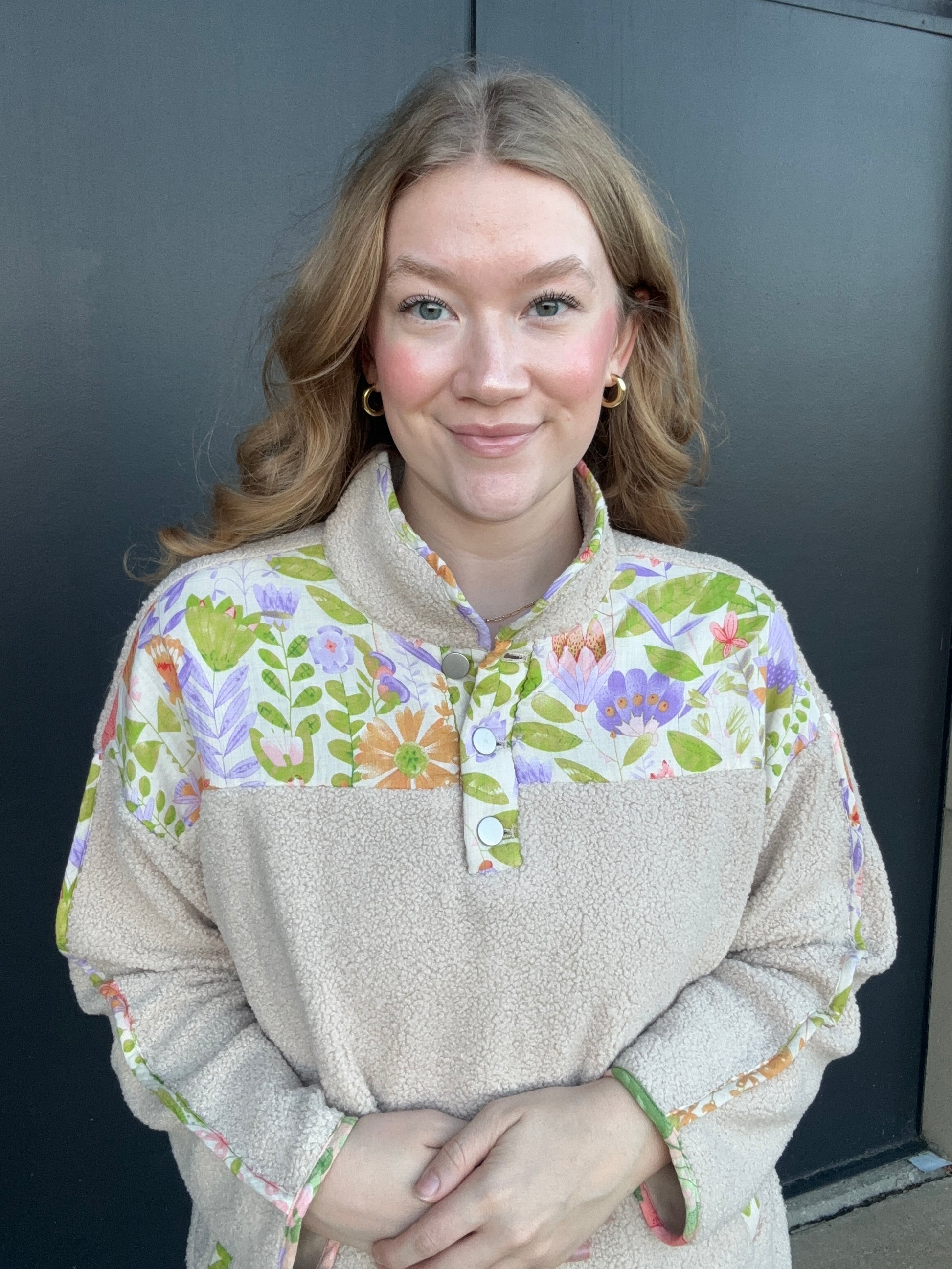 This henley teddy plush fabric sweater is cozy and trendy. Designed with floral contrast and eyelet buttons. Front functional pockets. Relaxed, oversized fit. Light tan color with pastel floral print accents, perfect for winter, fall, and all year round. Pair with denim, leggings or lounge at home in sweatpants. Olivia is 5'8 wearing size small.Â