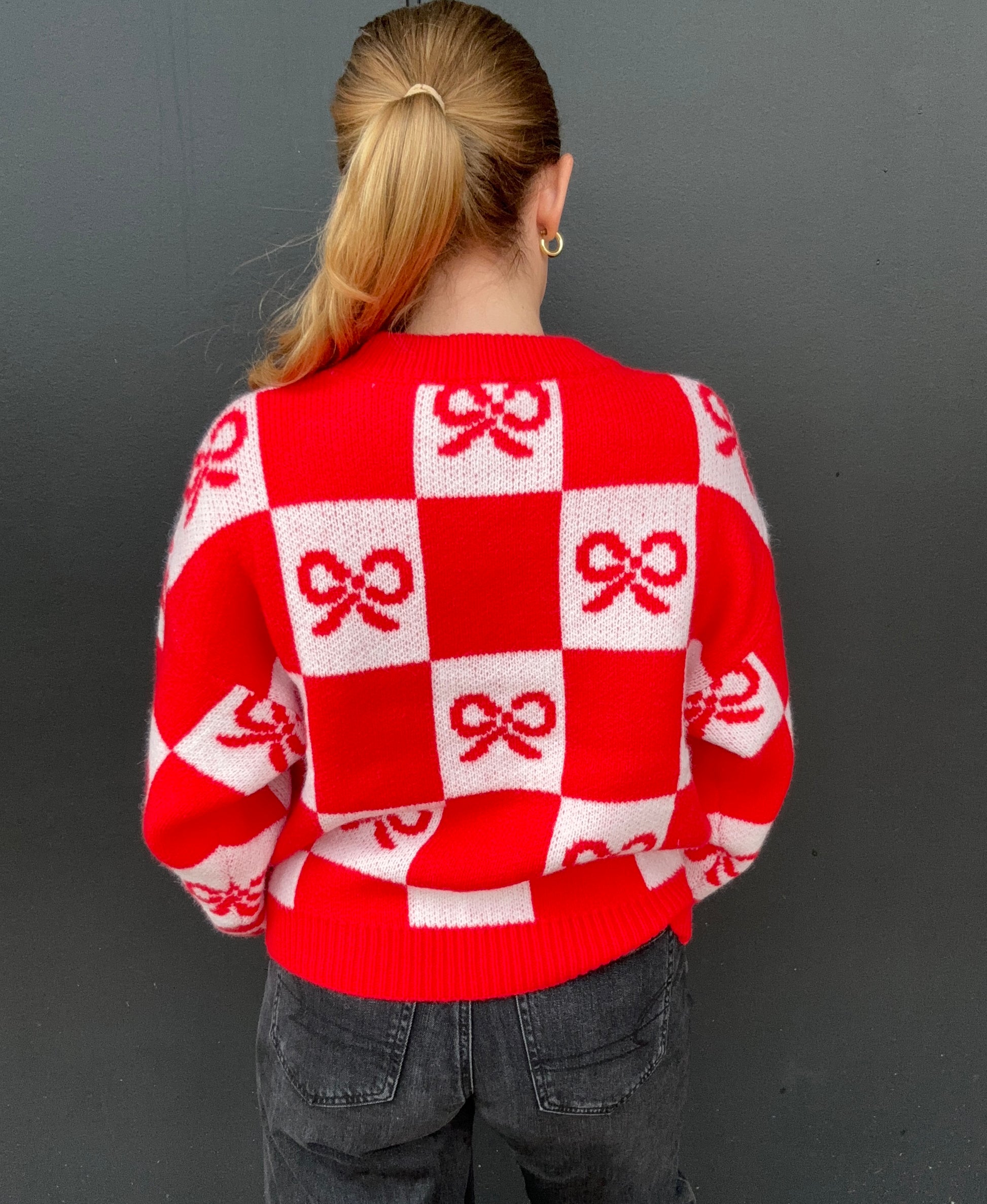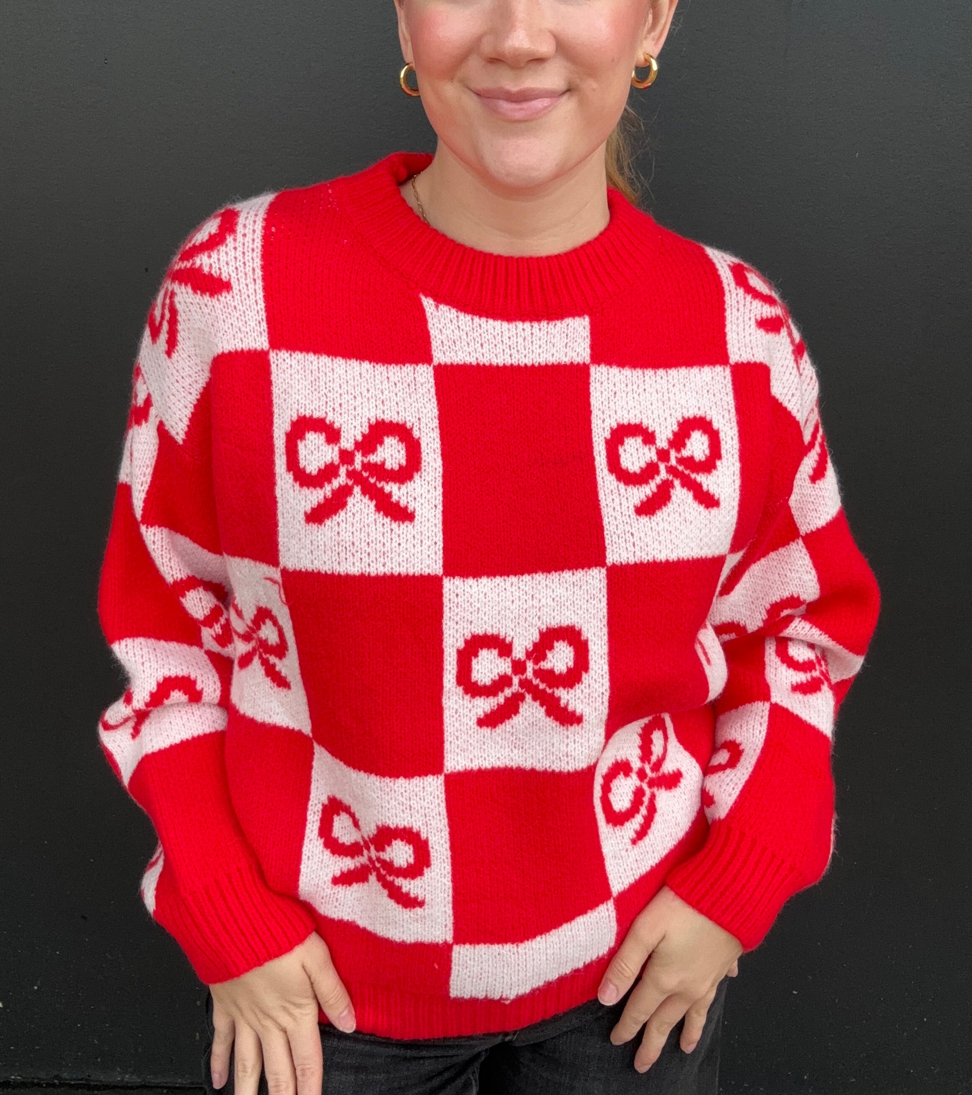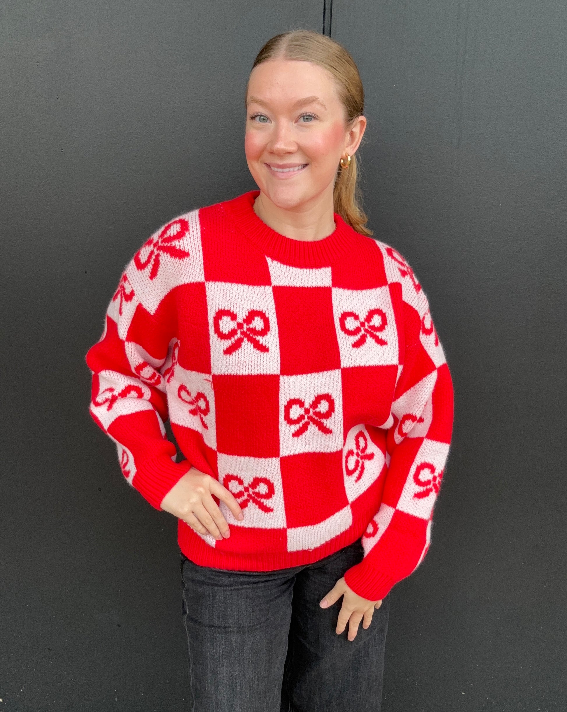 Trendy, cozy and bright sweater for the holiday's. This red and white checked sweater features darling red bows throughout. This sweater will keep you warm with its relaxed fit and drop shoulder sleeves. Pair with denim or a skirt and boots! Comes in S/M and M/L. Olivia is 5'8 wearing size S/M.