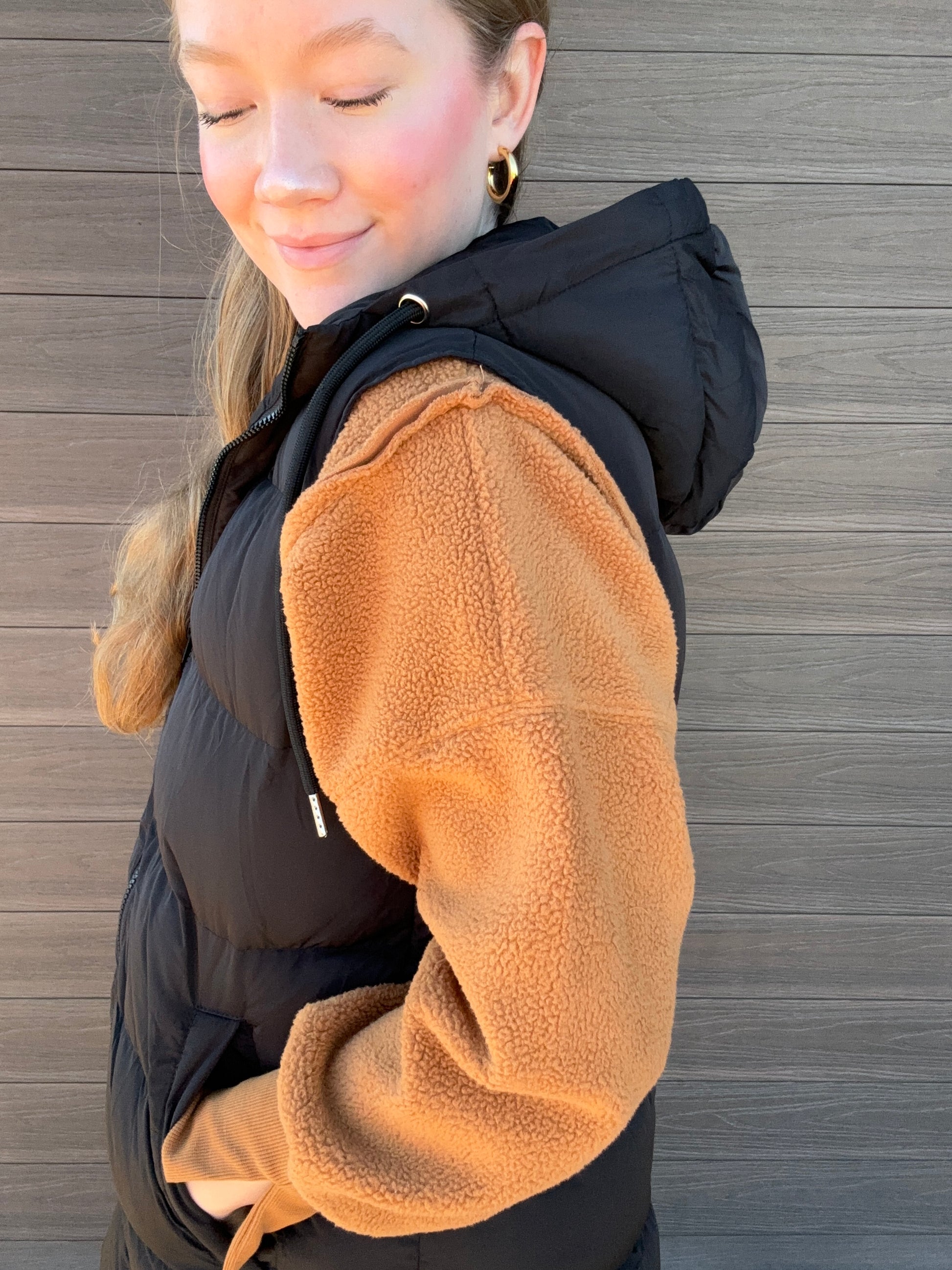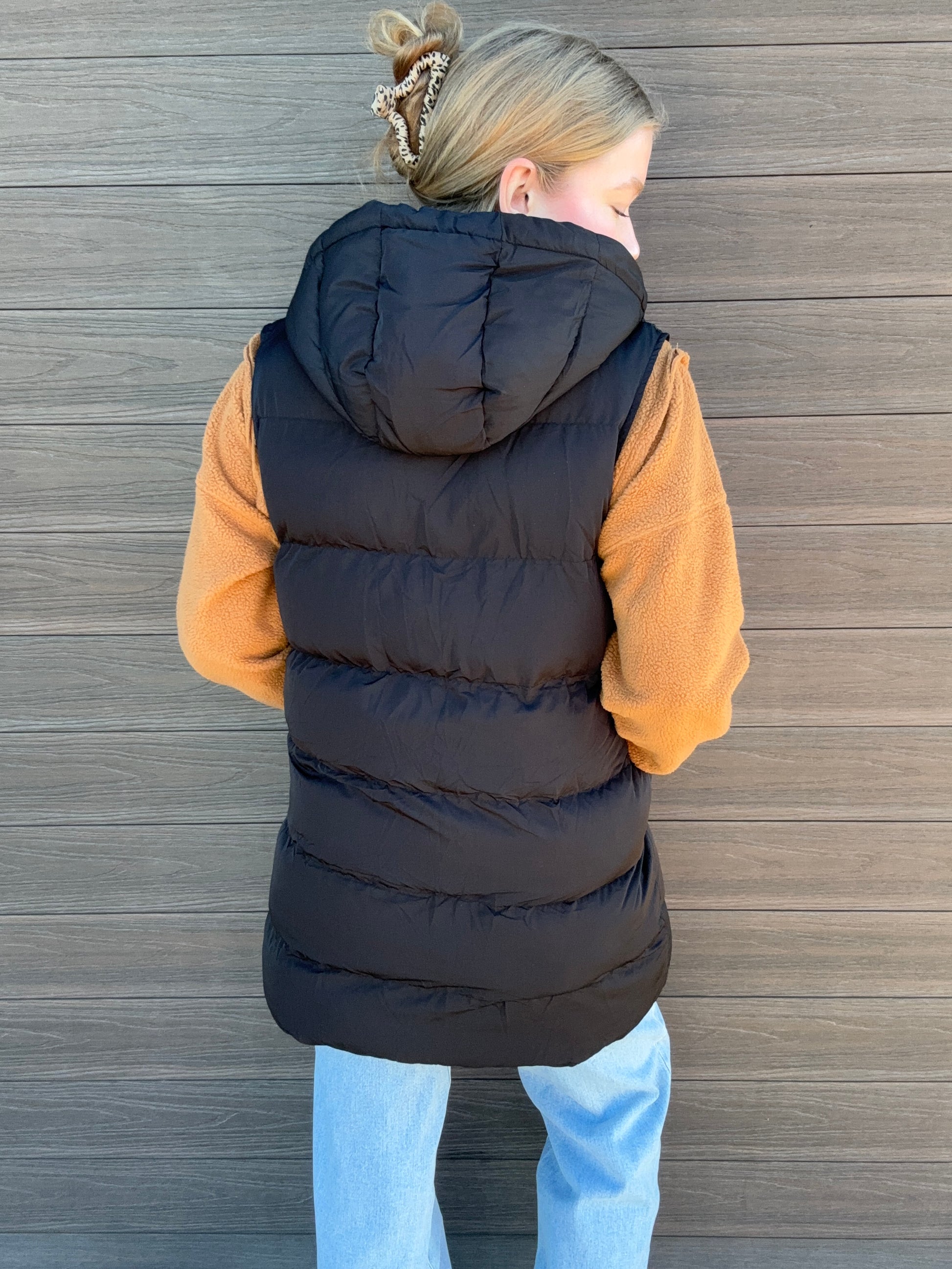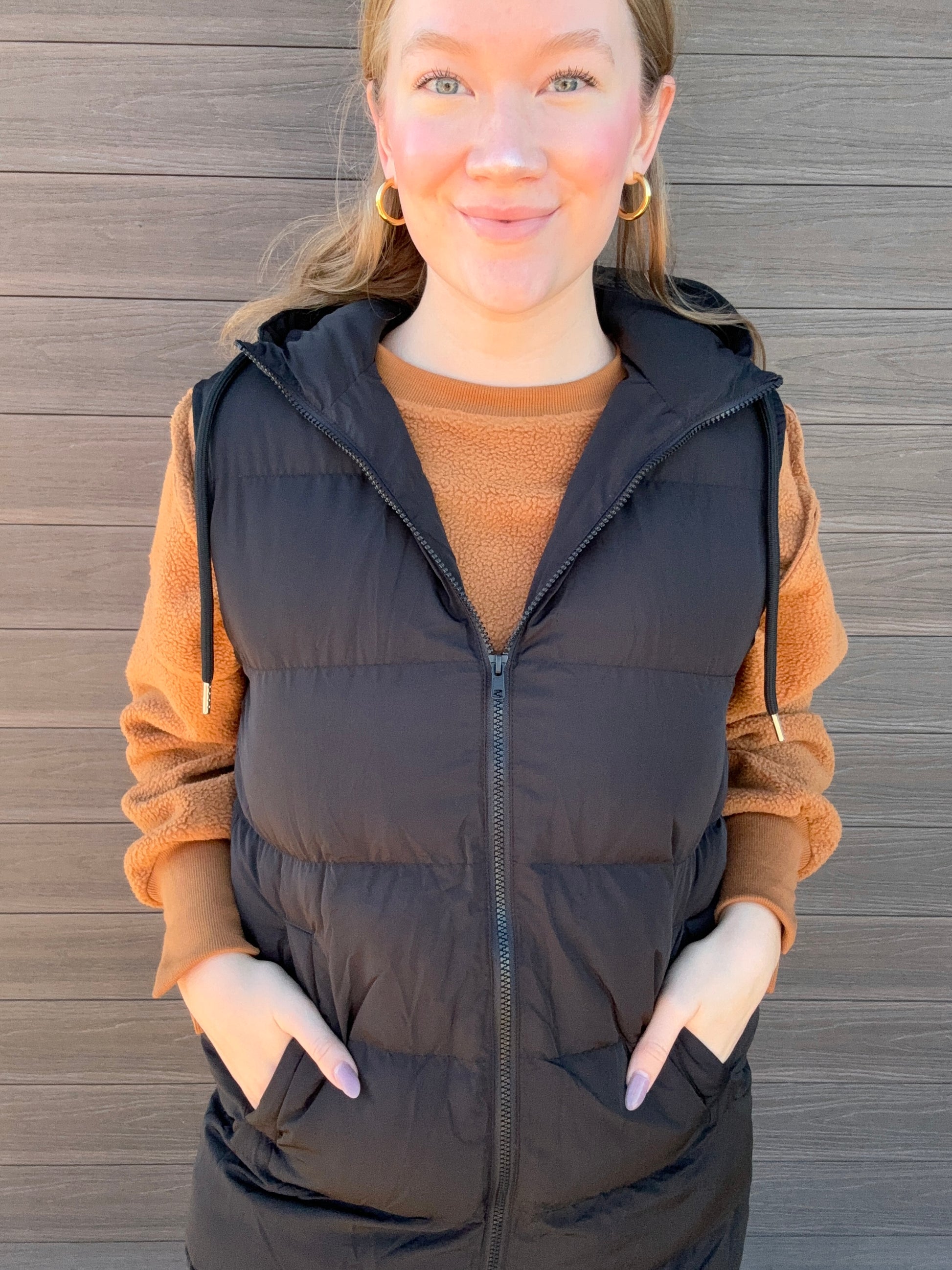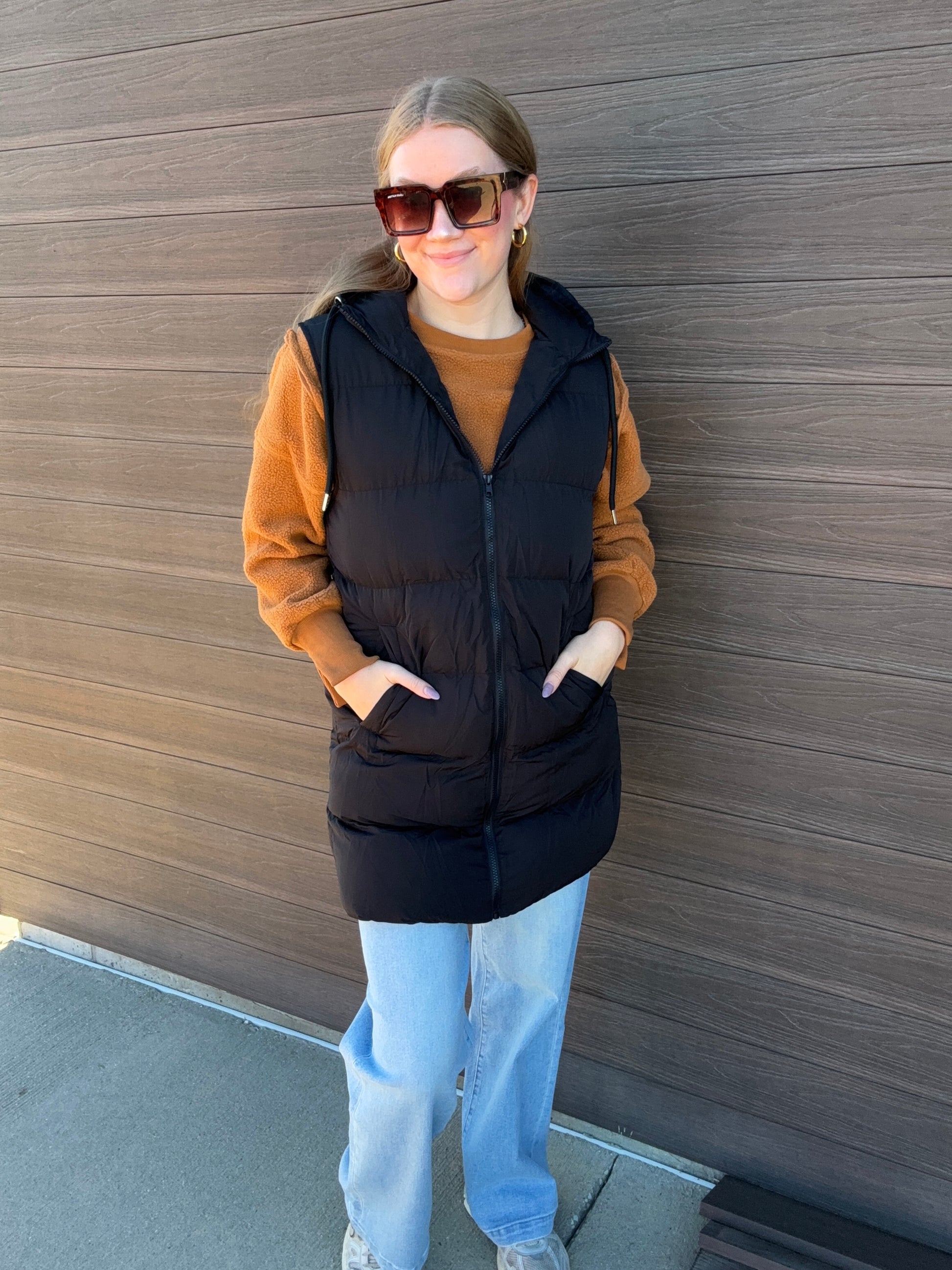 This stylish and functional vest features a hood for added warmth and a full-length zipper for easy wear. The longline design provides extra coverage, while the puffer material ensures maximum insulation. Perfect for layering over sweaters or long-sleeve tops, this vest is ideal for staying cozy and fashionable during cooler weather. Comes in a true black. Olivia is 5'8 wearing size small.Â