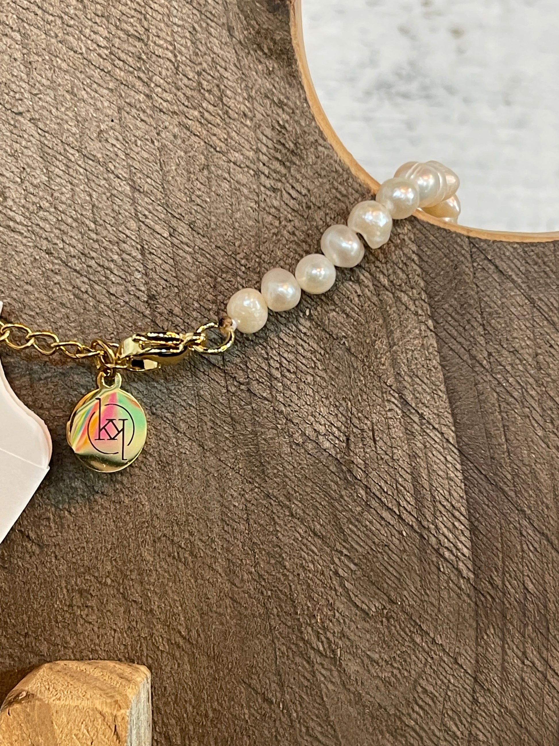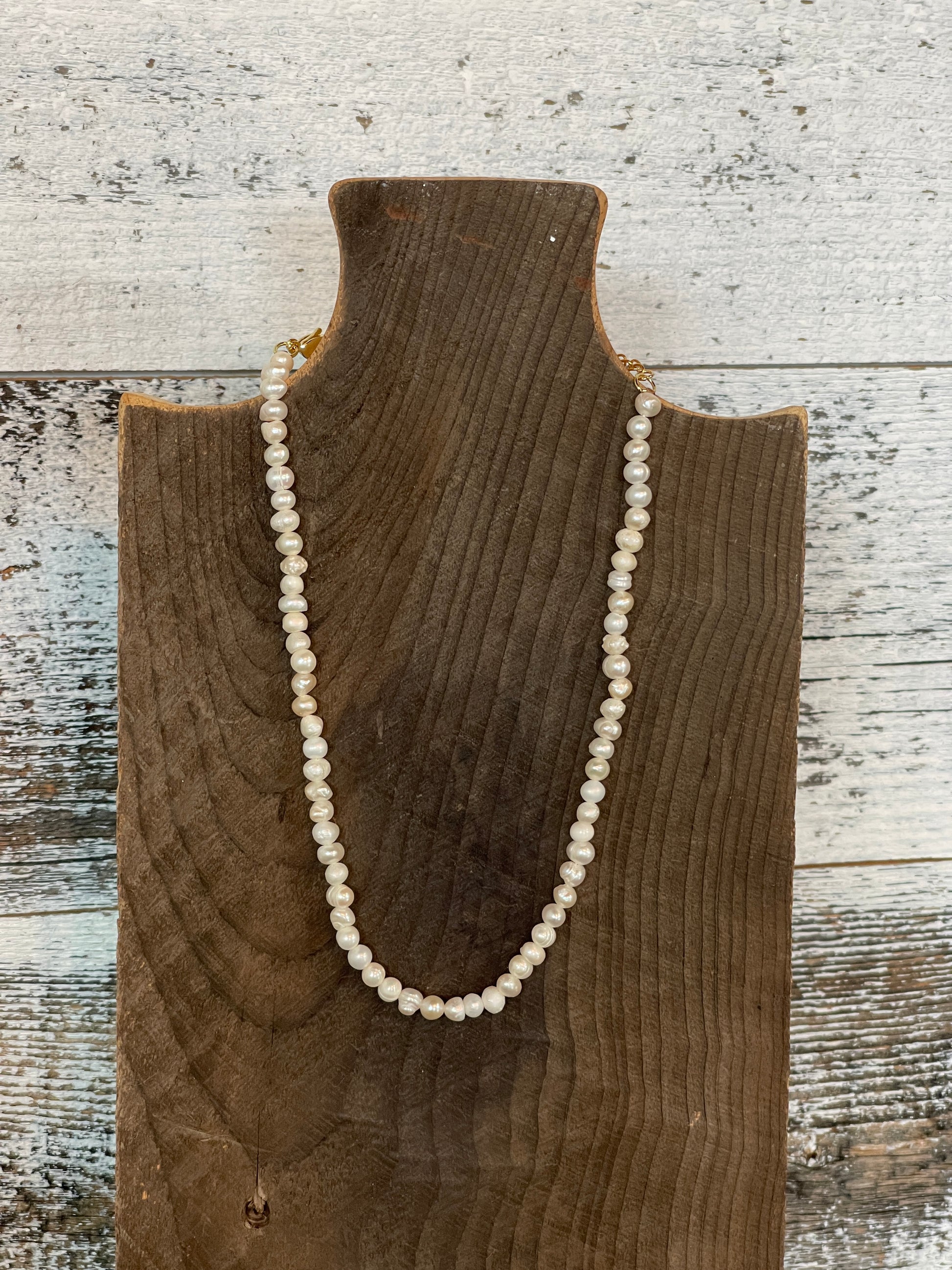 Pearl and gold necklace choker, 12" length with 3" extender.