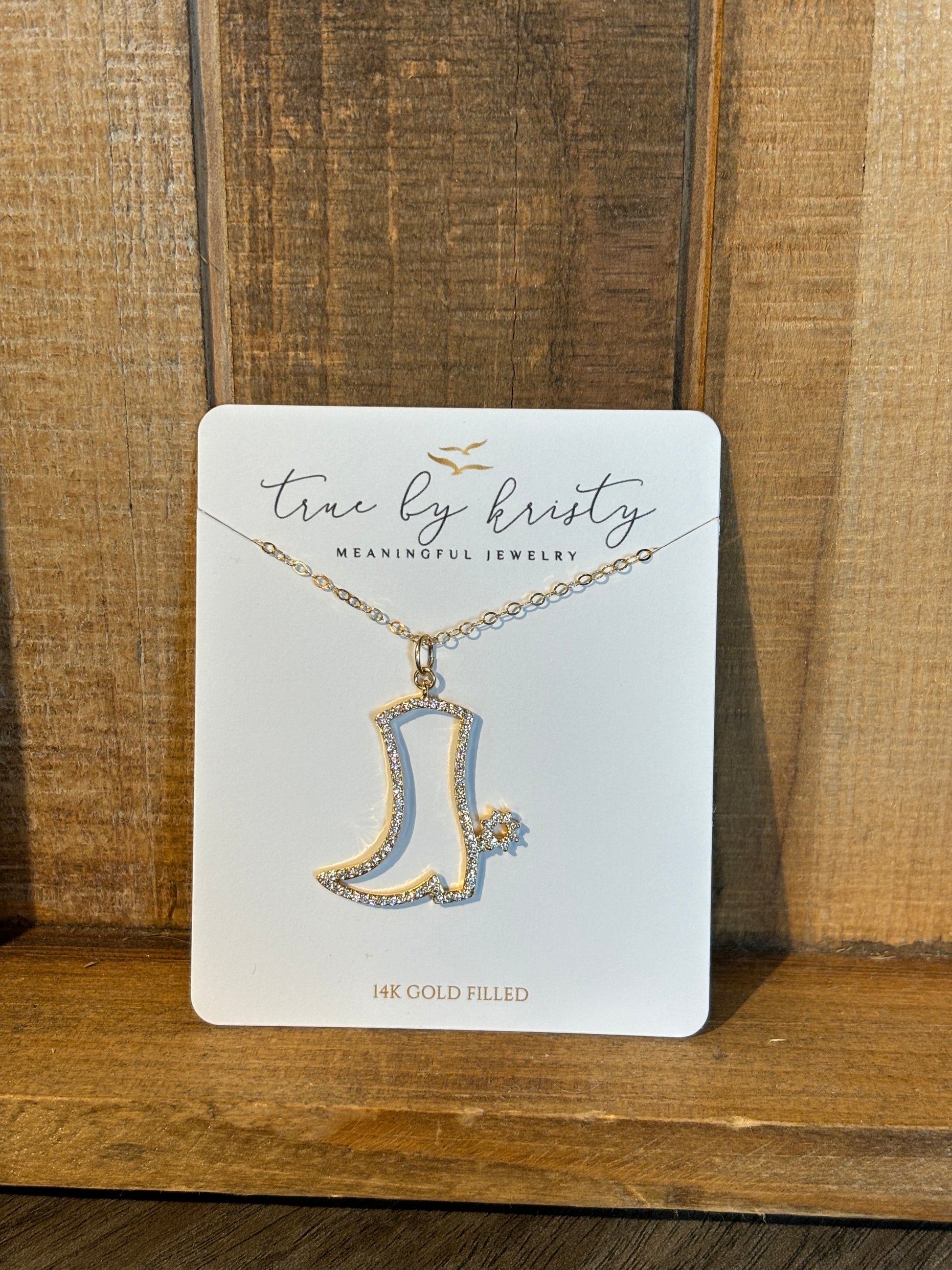 Gold filled cz cowboy boot pendant strung on 14/20 14k gold filled dainty cable chain. Length: 18” Chain: 14k gold filled signature dainty cable chain with spring clasp. Pendant: 27mm. Chain does not turn, tarnish, or rust. Handmade with the highest standards & quality materials. Includes 100% organic cotton jewelry gift pouch.