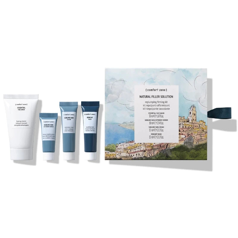 This natural filler solution kit is your perfect remedy for plump, firm, and hydrated skin. Kit includes Comfort Zone's Essential Face Wash, Sublime Skin Intensive Serum, Sublime Skin Cream, and Renight Mask.