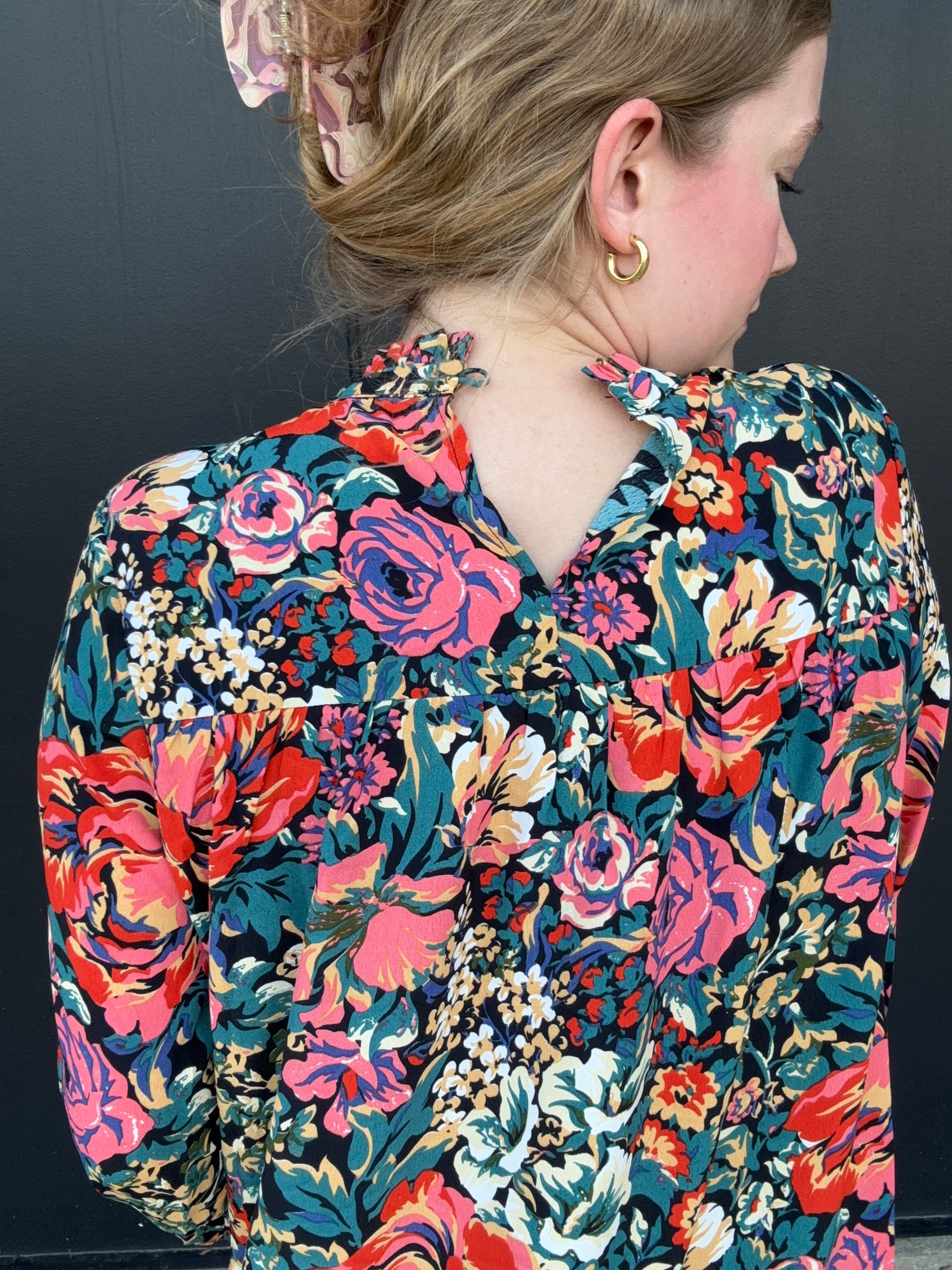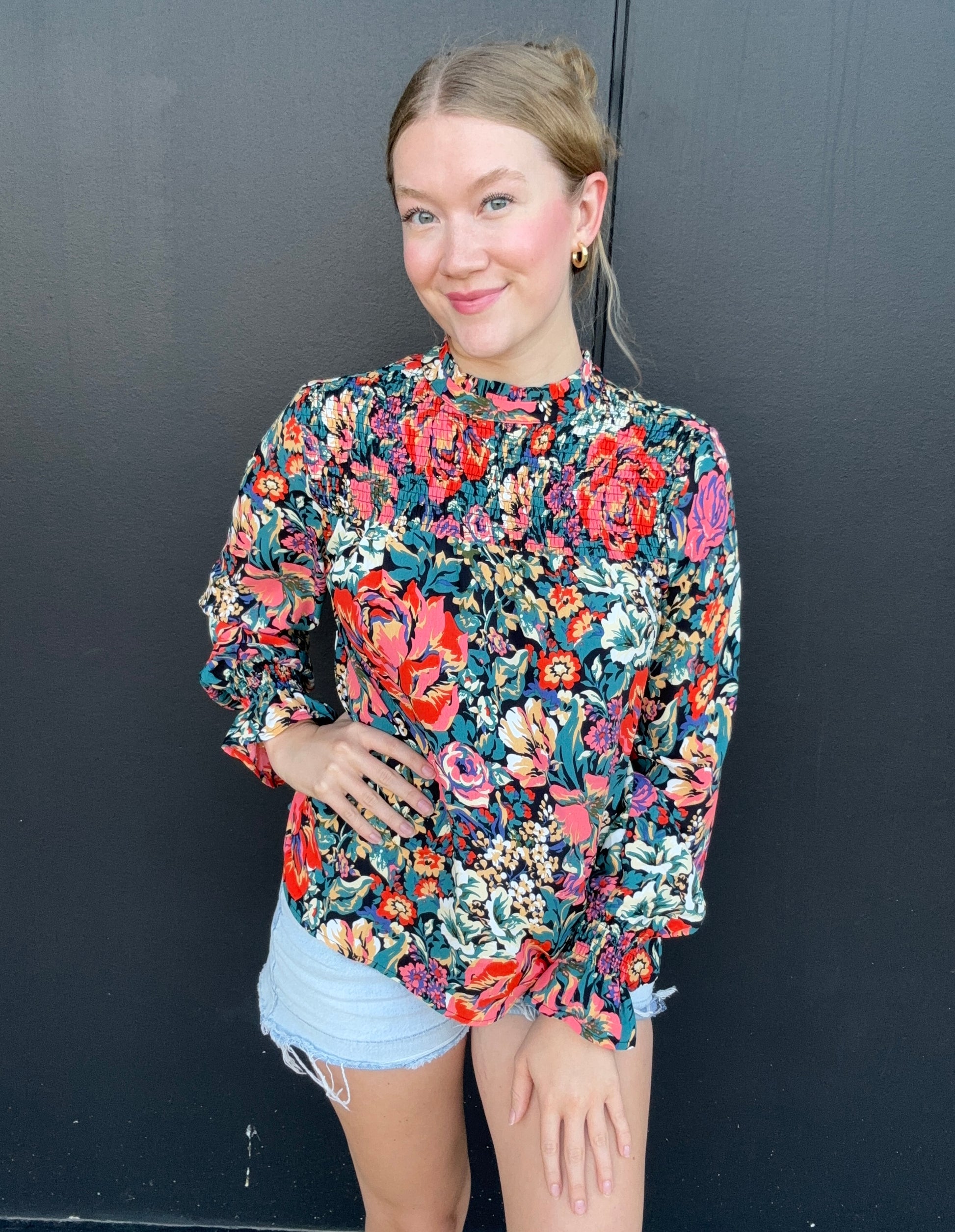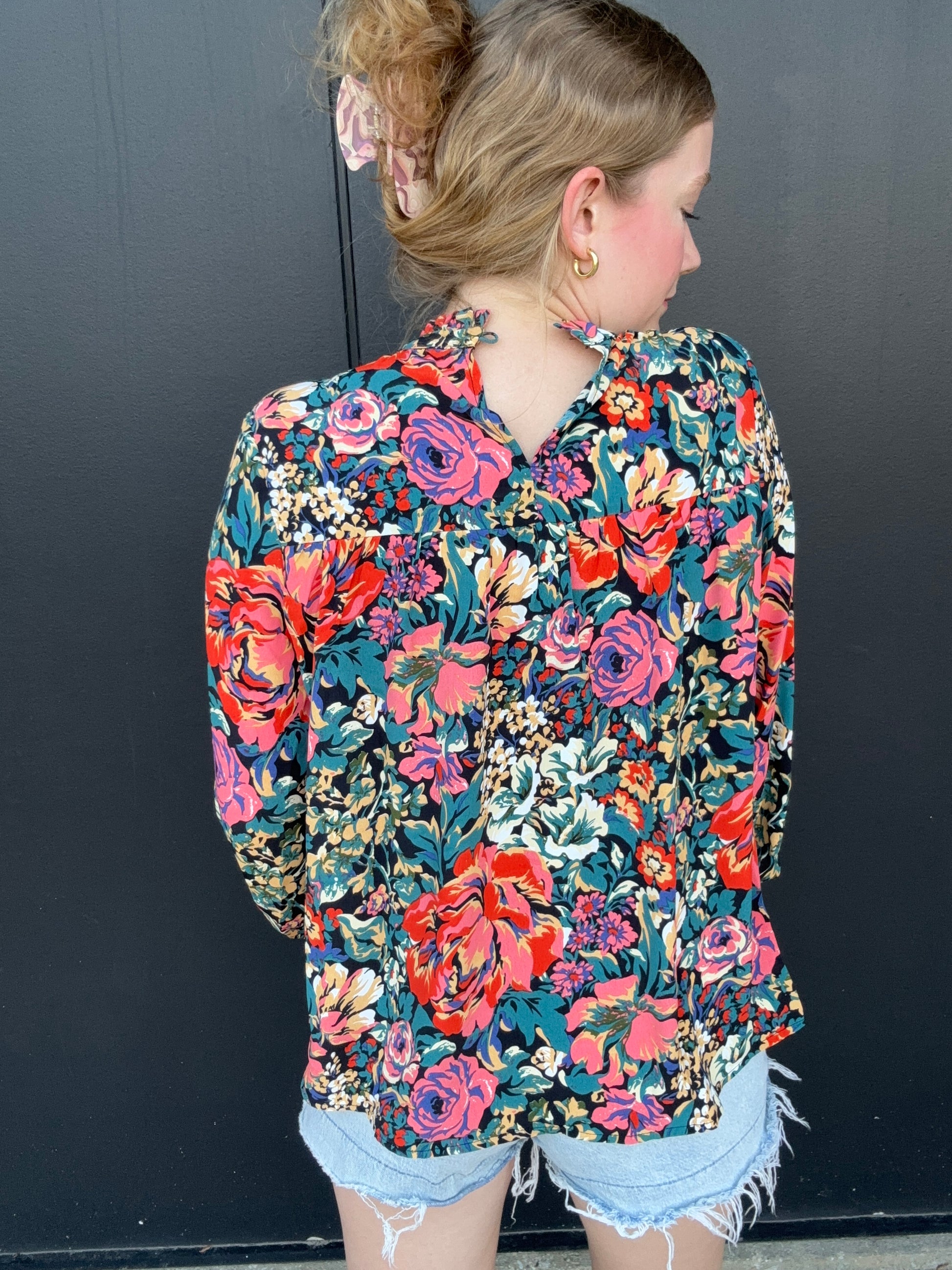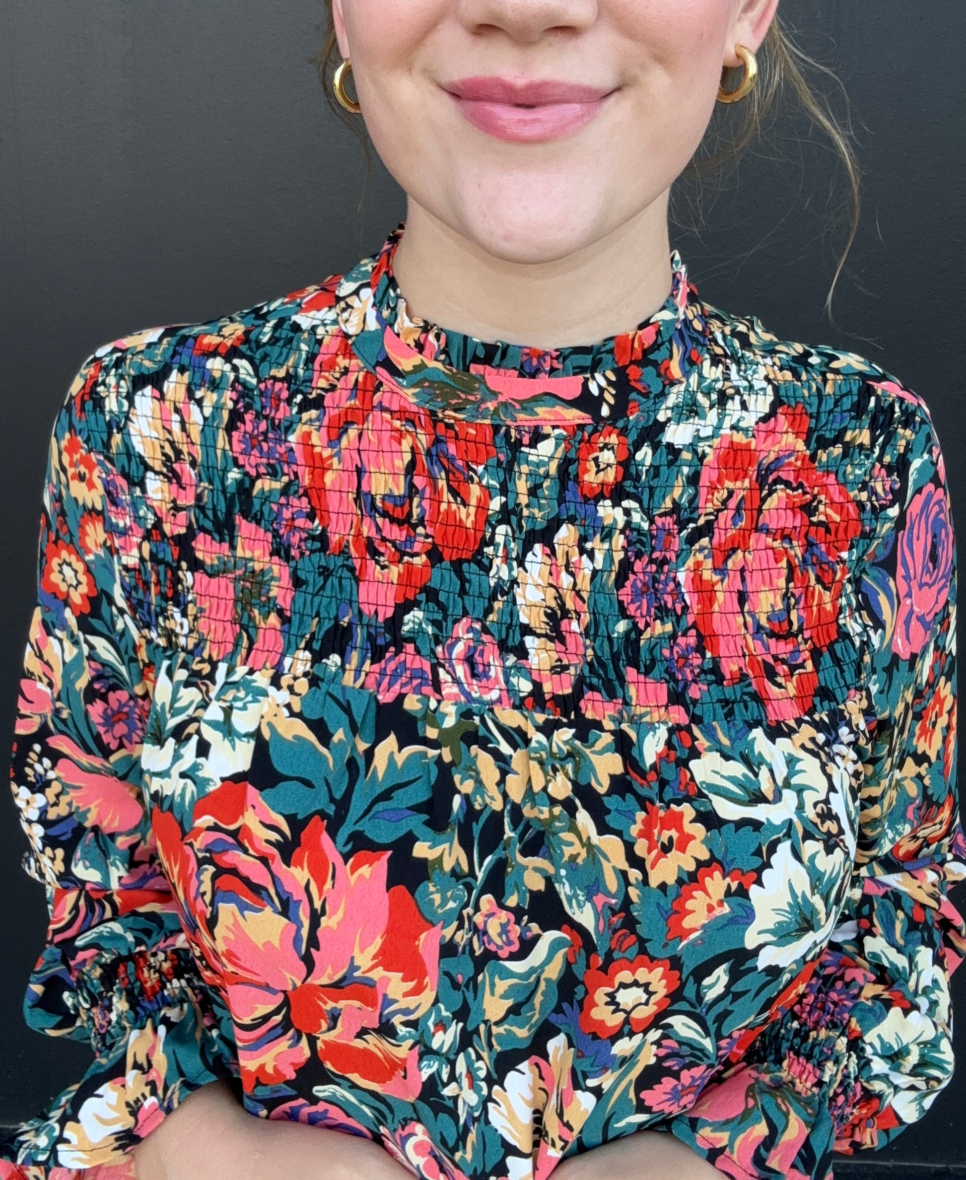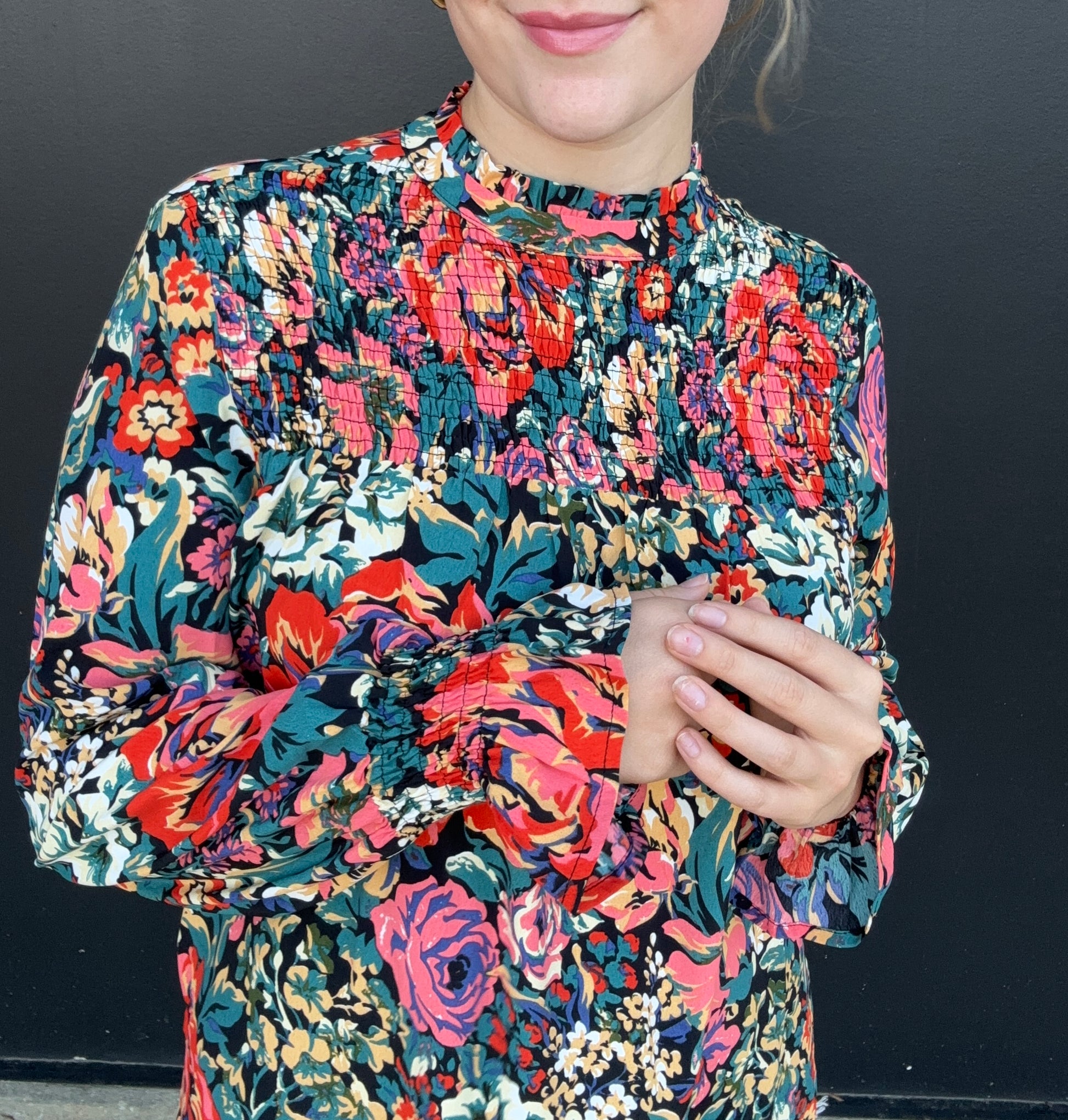 A gorgeous floral long-sleeve top for fall. Style for work or dress up with leather pants for a night out. The top features a pleated high neck, bell sleeves, and a flowy fit. Olivia is 5'8 wearing size small.