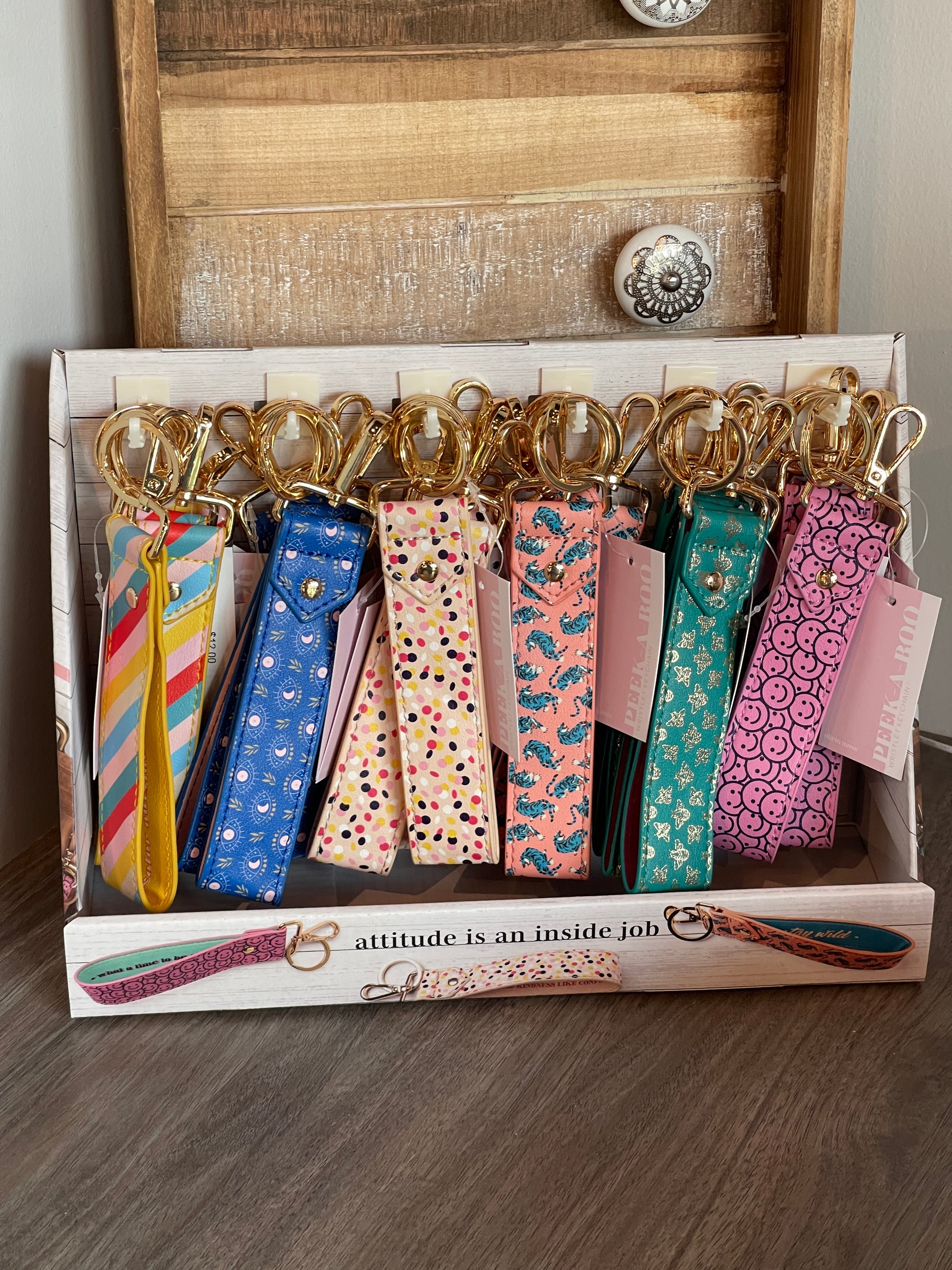 Super fun wristlet keychains to make carrying your essentials easy! Made in vegan leather, come in 6 prints - stripe, smiley, speckle, jaguar, mystery eye, and bee.