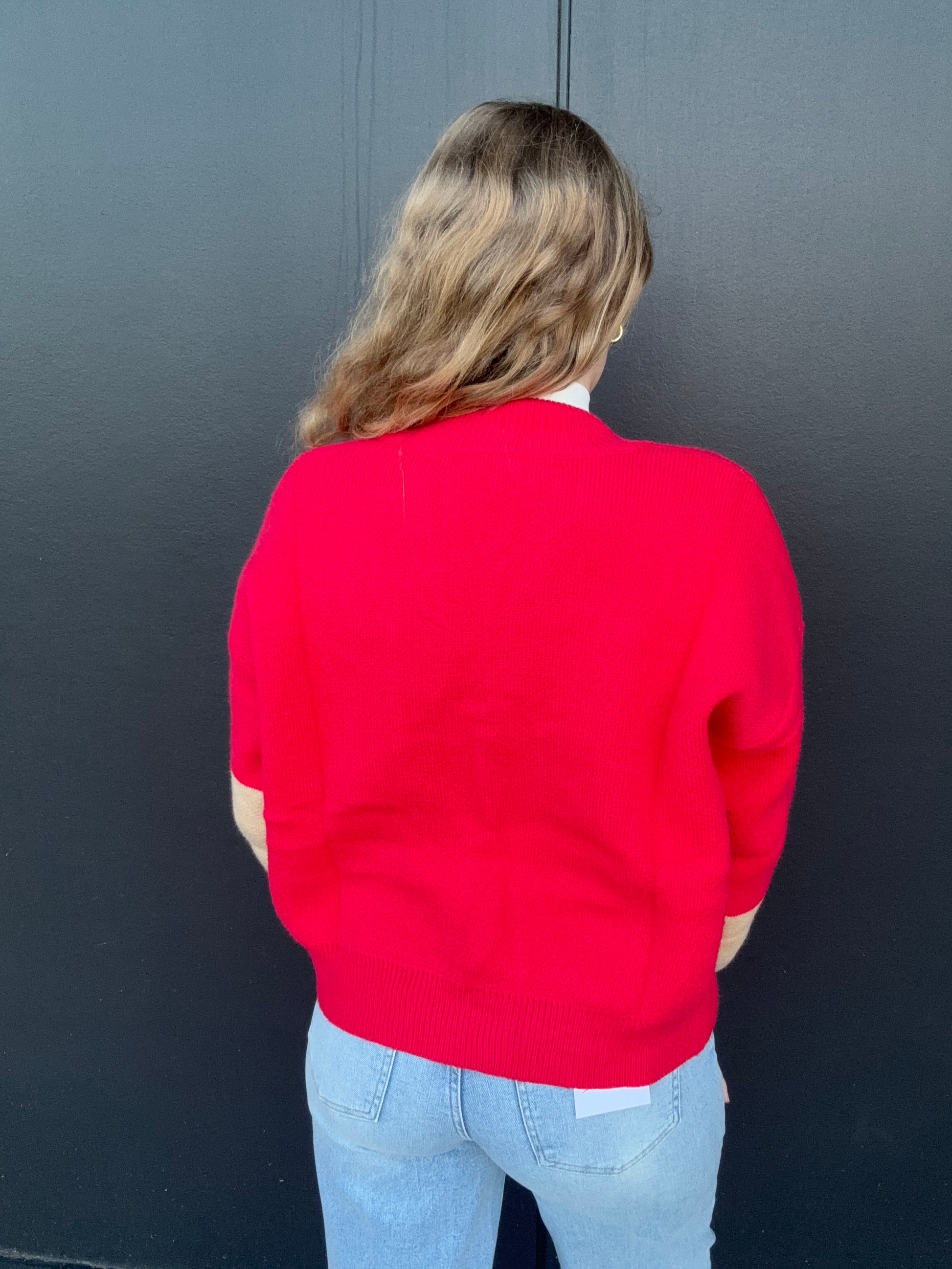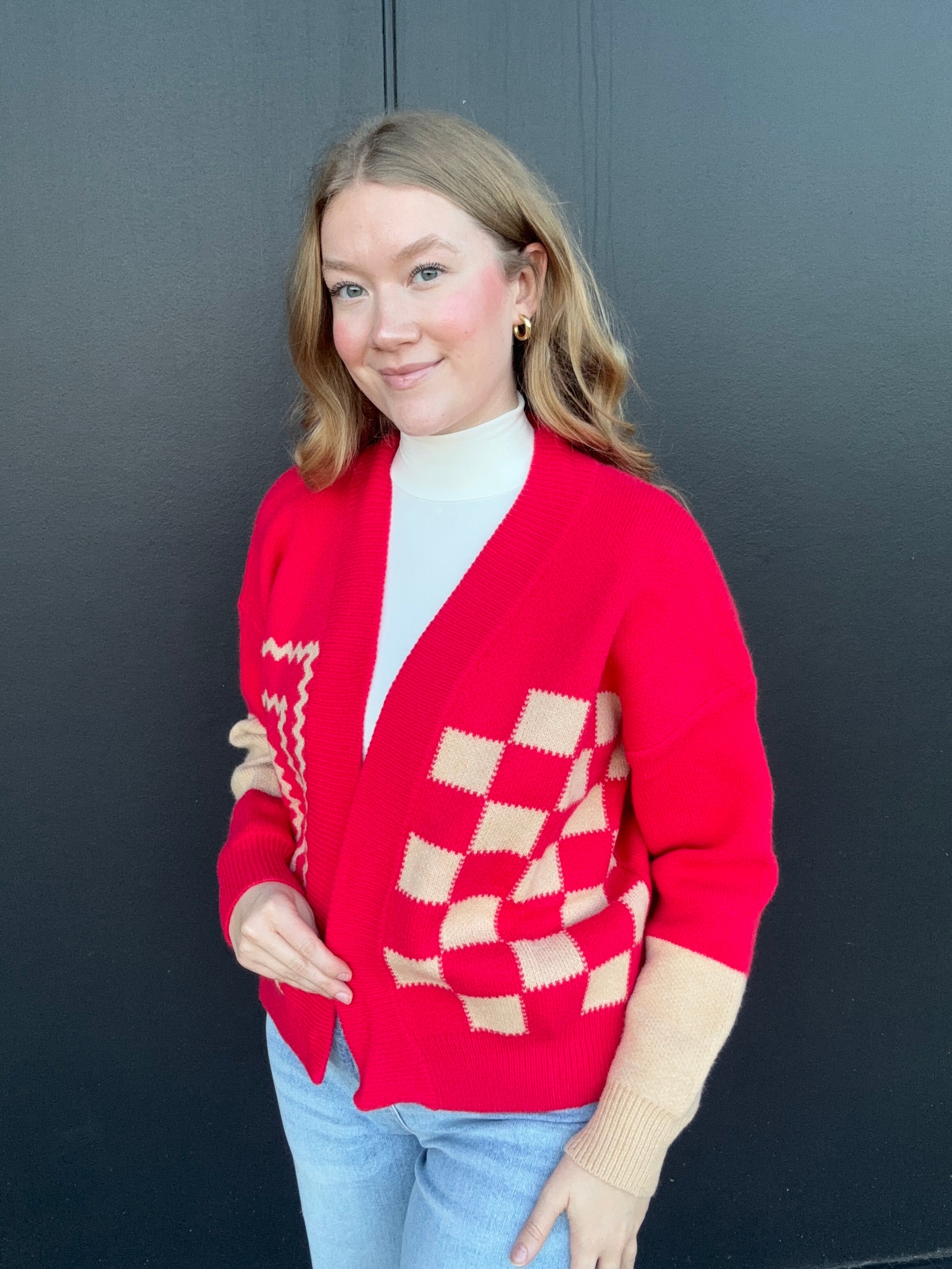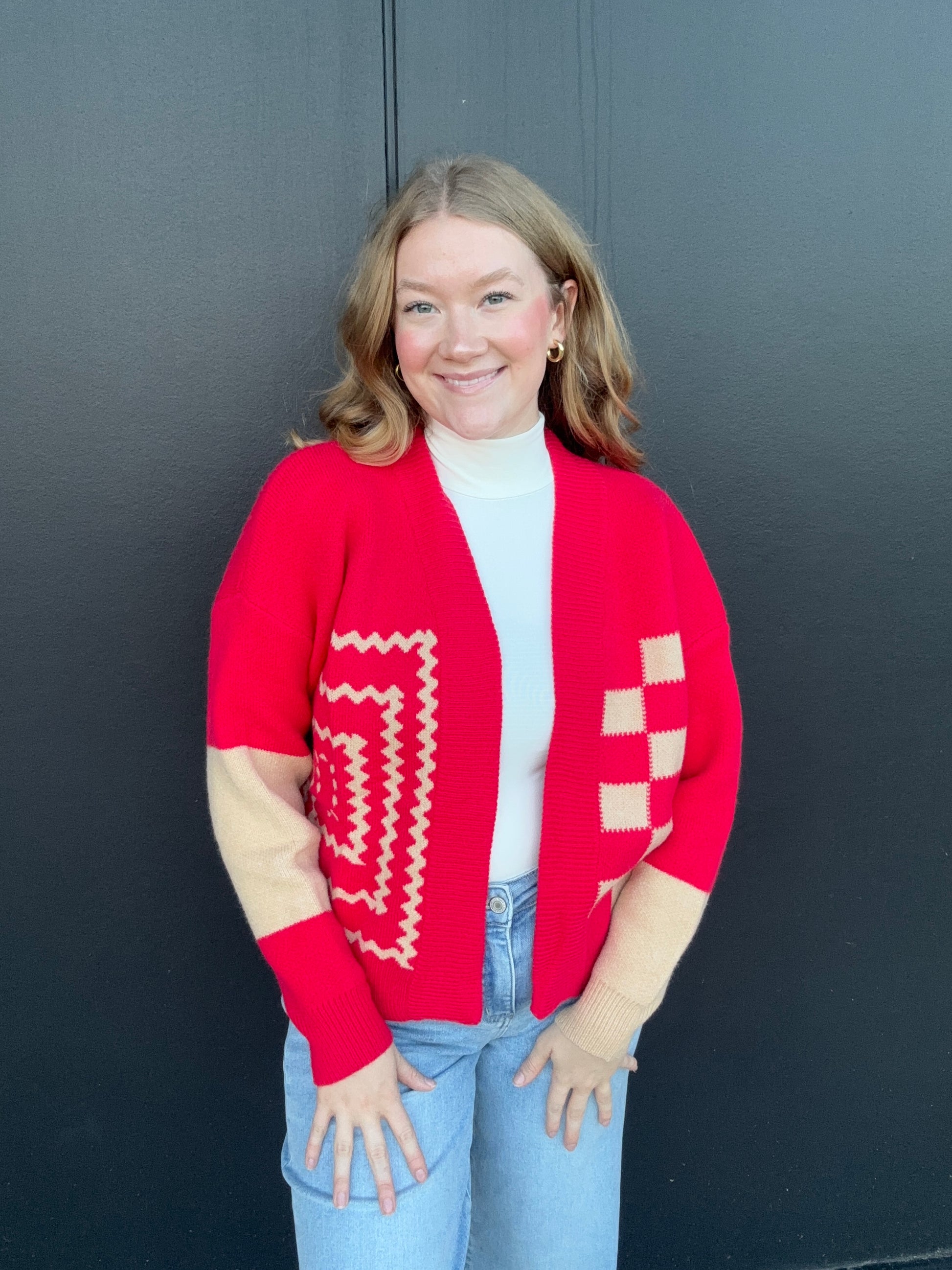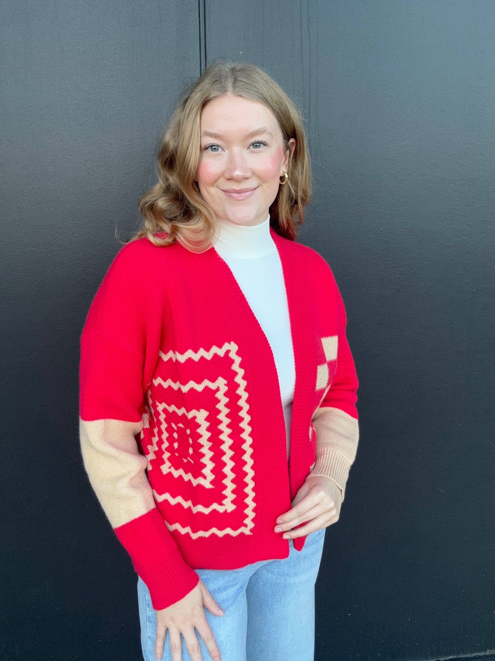 A unique, monochrome geometric pattern cardigan for the holiday and winter season. The red and camel color way is neutral yet vibrant, such a fun holiday piece. Pair over a camel, ivory, or green shirt with denim and boots. This cardigan is high quality and will keep you warm in the cool temps. Material is 42% acrylic, 28% nylon, 30% PBT. Olivia is 5'8 wearing size small.