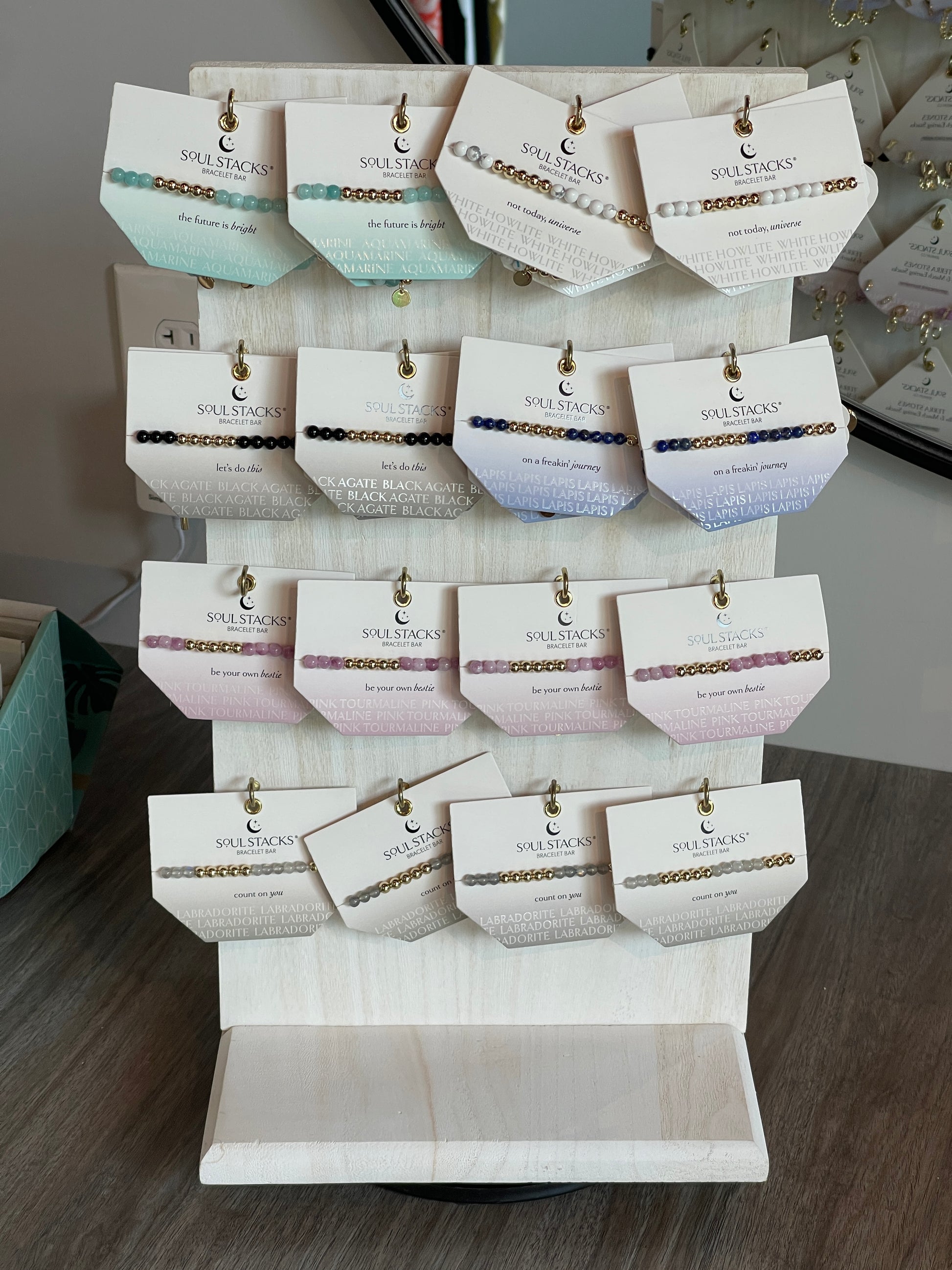 Stackable and beautiful genuine semi-precious stone bracelets! They are meant to be layered and stacked, but can be worn along as a statement. They are high quality gold tone and have a charm on each bracelet. Find your energy and channel it with these bracelets. Come in: aqua, white howlite, gray, black, purple, and blue.