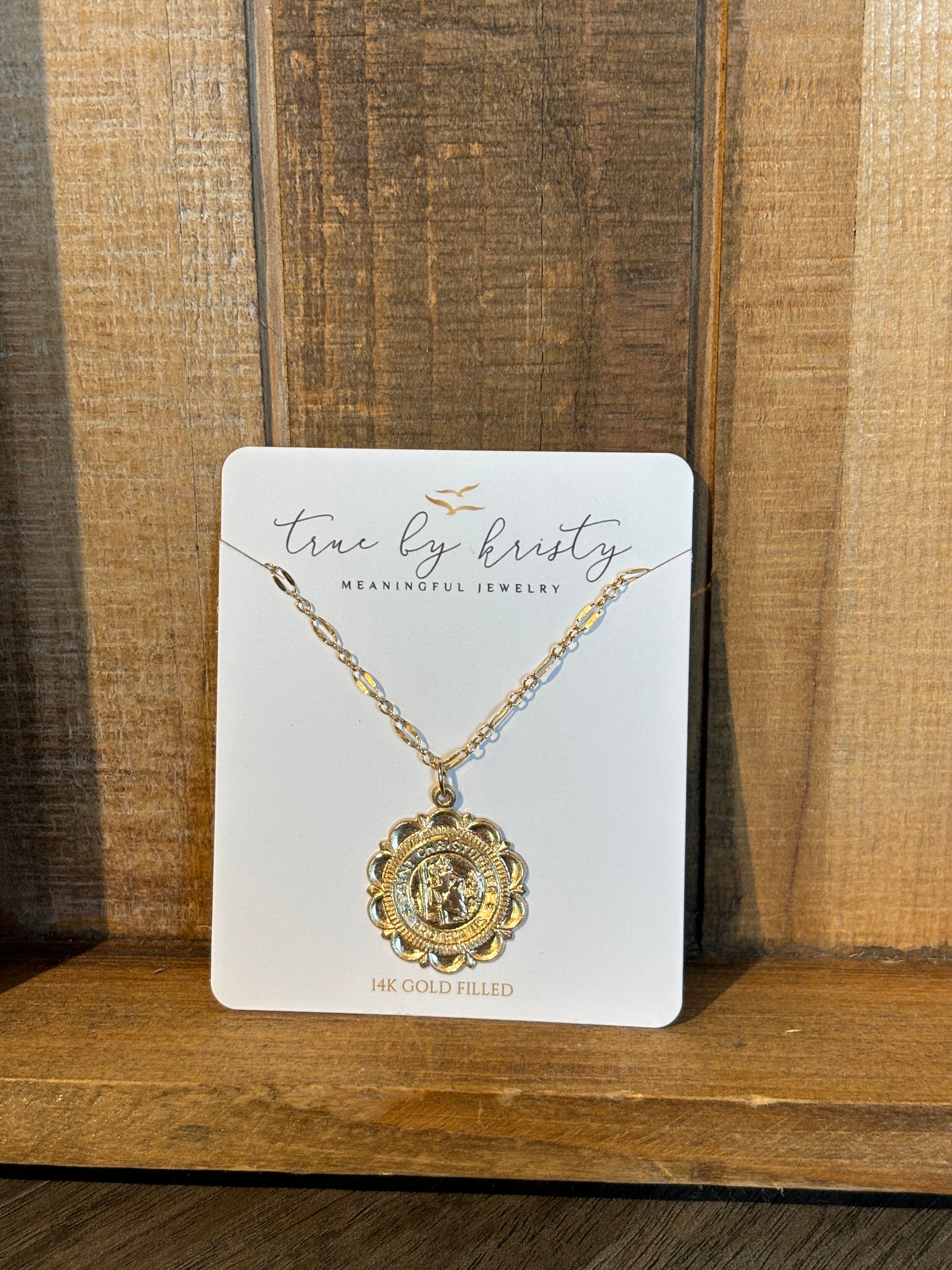Saint Christopher, patron saint of travelers. 14k 14/20 gold filled pendant and high quality gold filled dapped sequin chain. Length: 18” Pendant dimension: 1” Chain: 14k gold filled dapped sequin chain. Lobster clasp, high quality, 14k gold filled chain which is 14/20 certified and made in the USA. Chain does not turn, tarnish, or rust. Handmade with the highest standards & quality materials. Includes 100% organic cotton jewelry gift pouch.