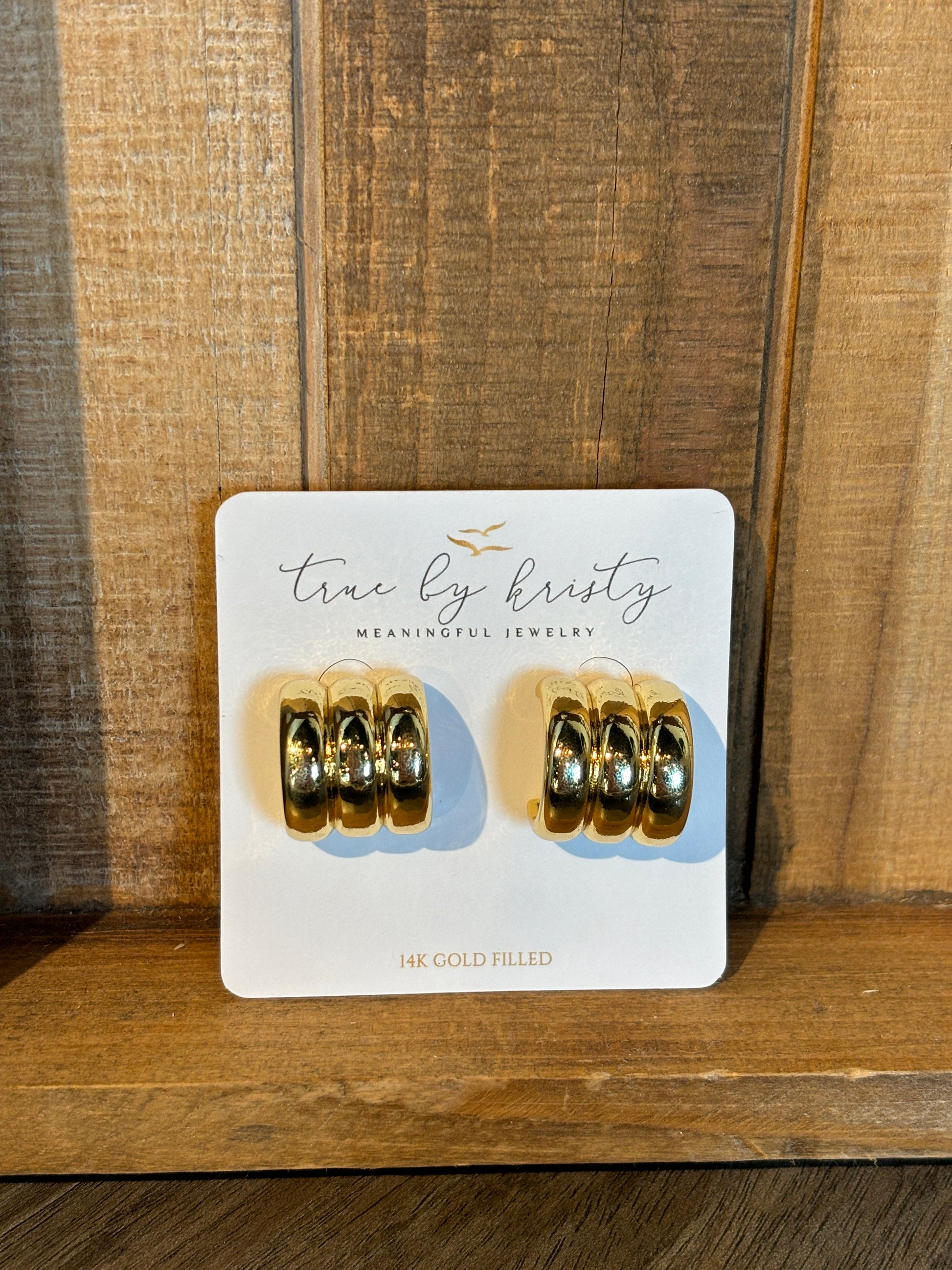 High quality 14k gold filled chunky hoops. Medium weight. Size: 25mm x 21mm. Stud posts, lead & nickel free, hypoallergenic, Includes organic cotton jewelry gift pouch. Our 14k gold filled earrings are high quality and will not tarnish, peel or rust. Gold filled jewelry can handle getting wet however, to prolong its beauty and overall longevity, here's what we recommend: